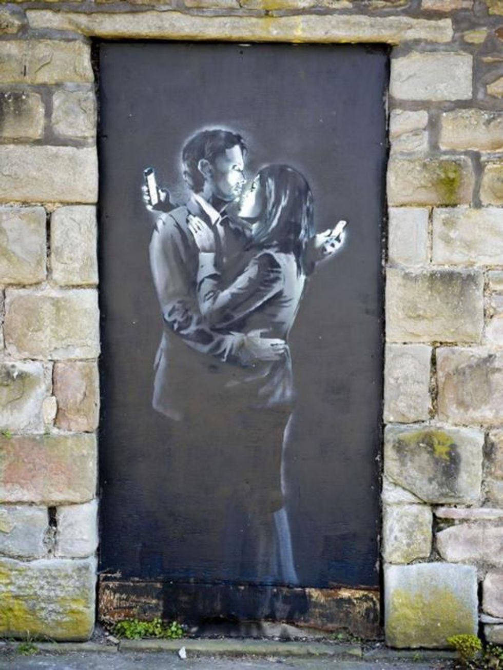 With this mural, Banksy is portraying the disconnect of people in relationships due to their mobile use. Sadly, it seems that our online connection is stronger than our connection to people in reality.