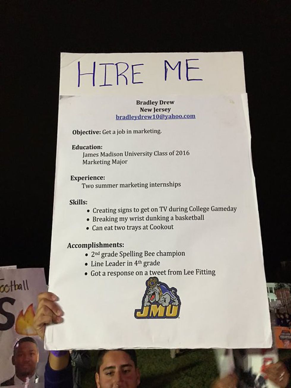 I knew it was going to be packed, so the day before the broadcast, Annie and I went to JMU to scout how many people were already there so we could figure out how early to get there. We spent hours getting our signs ready, which included a lacrosse shaft, a golf club, duct tape, and tons of pencil.