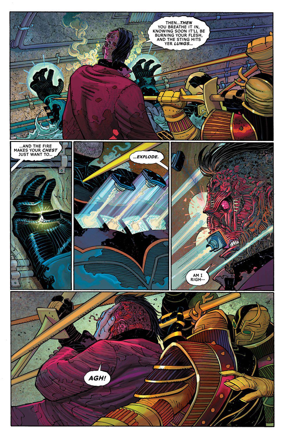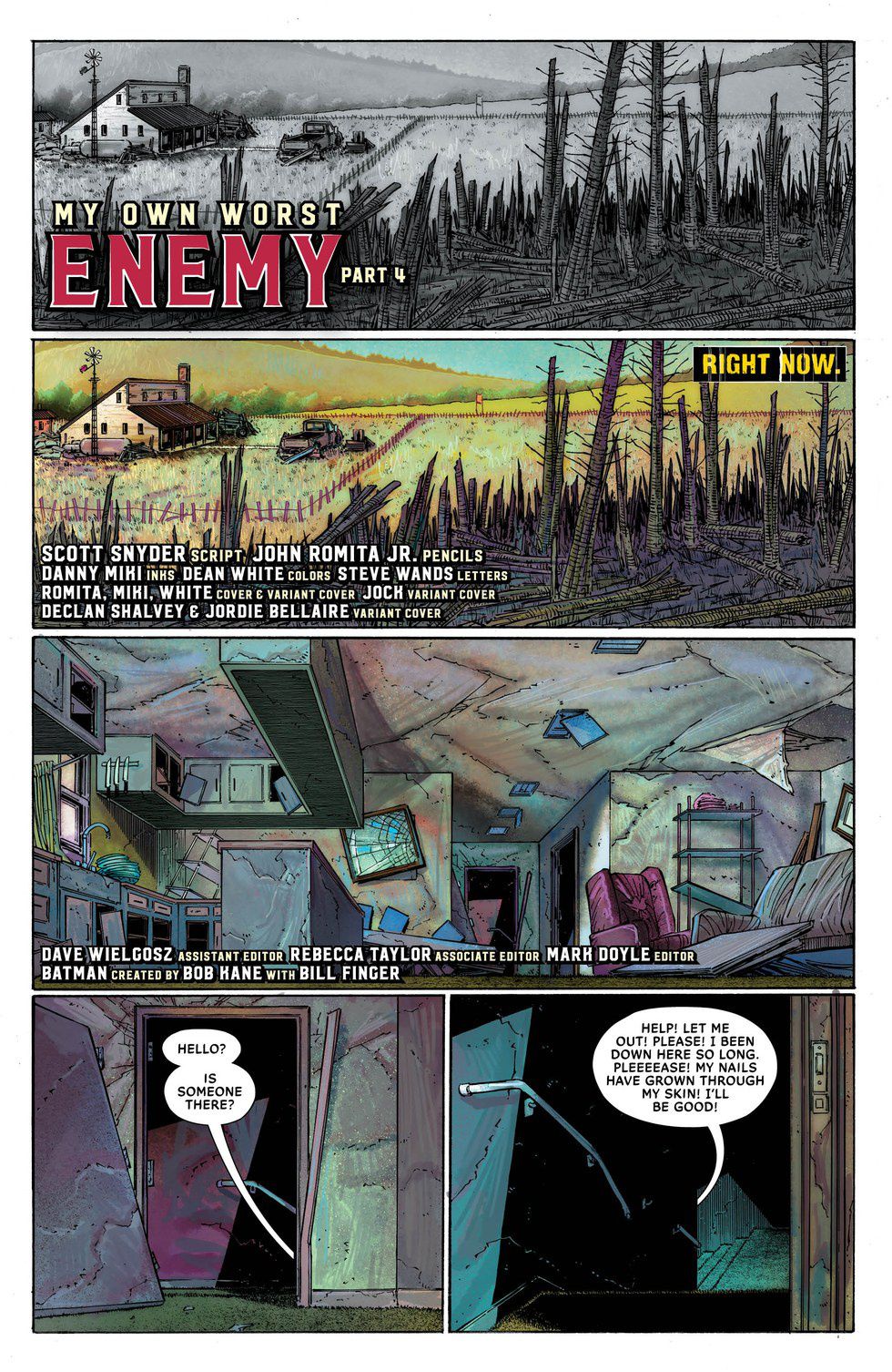 Speaking of the Clown Prince of Crime, Bruce's newest trainee, Duke Thomas, makes a passing reference to that relationship in what seems to be the final chapter of the back-up story about Victor Zsasz. While the exact moment seems a bit of a cheat considering the point Duke makes is something both we and Bruce should already know, the rest of the story is arguably the best thing about the issue. The Two-Face story is exciting, but dialogue is often so heavy-handed and the action is so relentlessness that it can be a little taxing. There's a strange comfort in this normal, if twisted, detective story that doubles as Duke's evolution into full superhero. That's thanks, at least in some part, to the art. Declan Shalvey's figures are a deal less stylized than John Romita Jr.'s in the main story and Jordie Bellaire's coloring is more subdued than Dean White's sub-Tarantino shades.