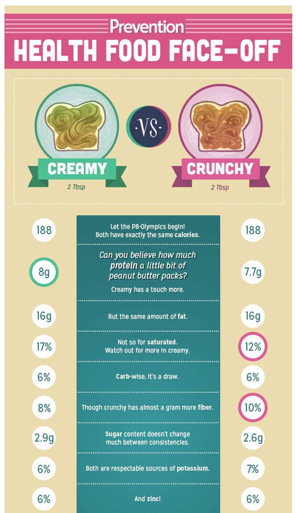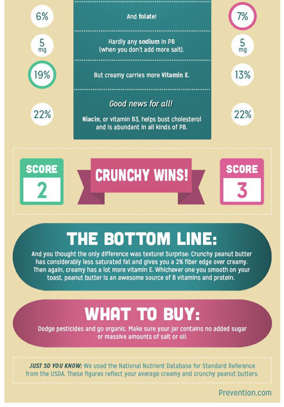 Alas, crunchy peanut butter finally prevails. Prevention.com examined the healthiness of each peanut butter and determined that crunchy peanut butter wins the face-off. Crunchy peanut butter has less saturated fats, a gram more fiber, and extra folates. While I’m not all too sure what folates are, their data is hard to argue with. In the end, if all that you are looking for is a healthy sandwich, crunchy peanut butter is the way to go.