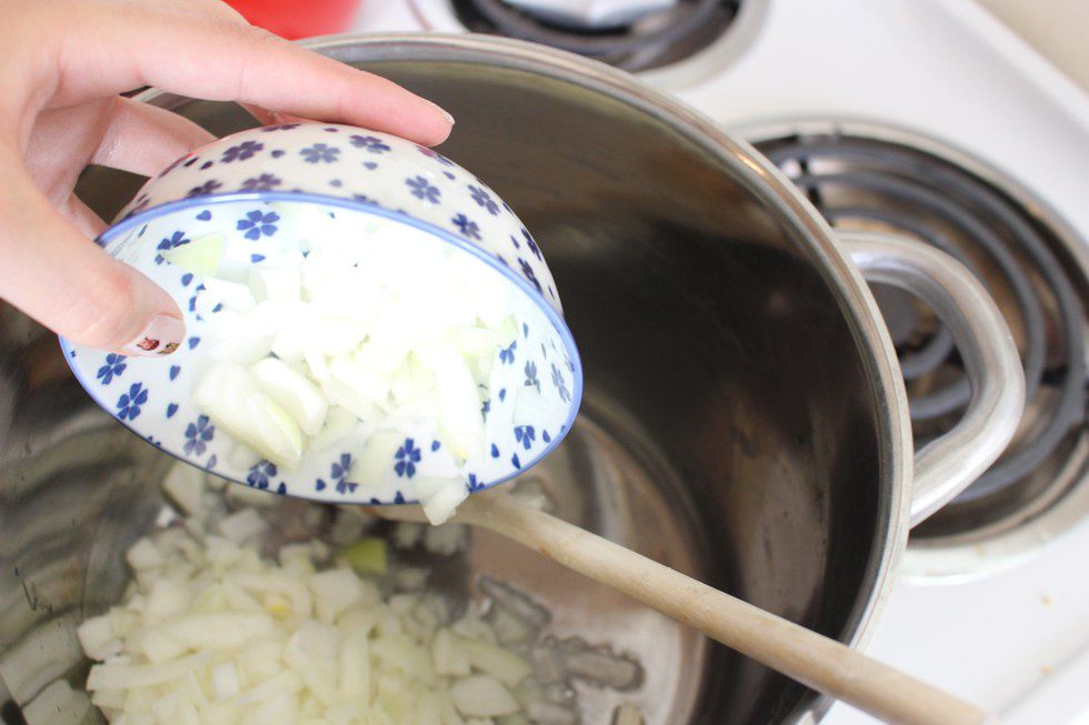 Place onions into a pot with 1tbs. of coconut oil and keep at high heat. Stir occasionally until onion becomes almost transparent.