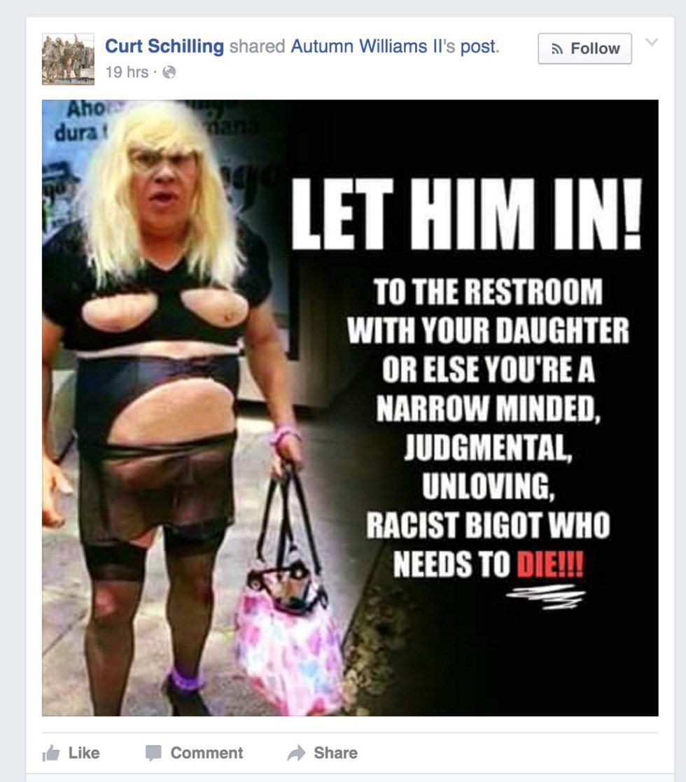The post showed a man wearing a wig and women’s clothing. It said “LET HIM IN! to the restroom with your daughter or else you’re a narrow-minded, judgmental, unloving racist bigot who needs to die.” Schilling replied to the post saying, “A man is a man no matter what they call themselves. I don’t care what they are, who they sleep with, men’s room was [sic] designed for the penis, women’s not so much. Now you need laws telling us differently? Pathetic.”