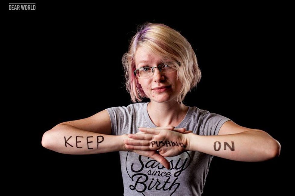 My story is a simple one. I had a lot of stuff thrown at me at once when I was in high school. I had a major knee injury and surgery followed by a close family member passing away and then a trip to the ER that ended in finding out I had severe anxiety. I'm now in the middle of my second year of college. I've faced struggles that I don't quite care to voice sometimes but I've found a home here and made some friends who could be family. I just "Keep pushing on" and seek the help I need and push others to do the same because we're not super man but we're pretty super sometimes.