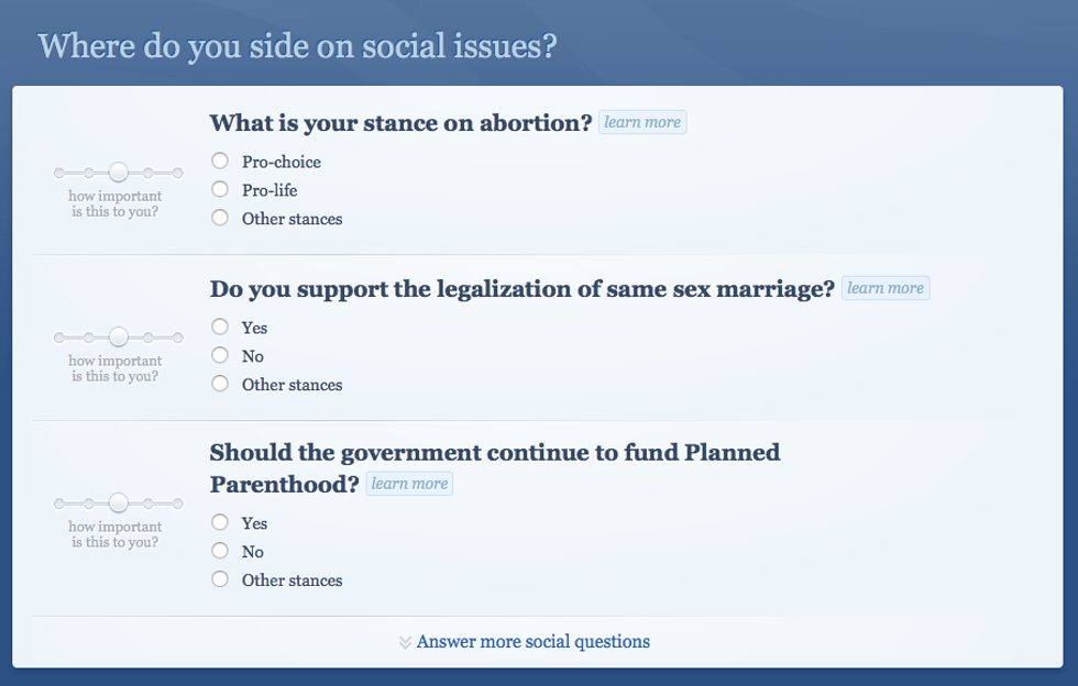 Unsure about which candidate you should vote for? A website called ISideWith.com matches your beliefs with a possible Presidential candidate. The quiz is about 28 questions, with the option to answer additional questions for some categories to get better results. The questions have either yes/no answers, as well as more detailed answers and the opportunity to write your own. Topics are on important issues such as gun control, abortion, gay marriage, minimum wage, and Muslim immigration. You can also rate how important each specific topic is to you, from least important to most important. When you submit the quiz, it compares your answers to the answers of the candidates. The results are very informative, telling you which political party and candidate you side with most. It also breaks down your answers for each topic to see how you match up with each candidate.