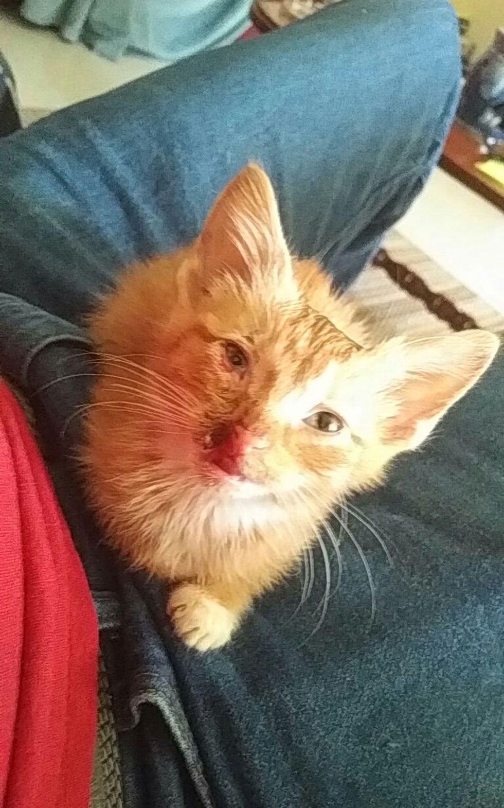 My first fostering experience ended tonight. My fiance picked up a small orange kitten who was stranded and alone on a busy highway leaving our town. His lip was busted and hanging off, his face bloody, his body tense, his teeth crooked or missing. It took him and his friend a while to calm him down, but they eventually got him in a car and took him to the vet. He was in really bad shape -- dehydrated and beaten up, only about five or six weeks old. He had to stay for two nights, and we were given a very reasonable price to pay for their care, which was kind of them and very encouraging for the future if we happen to find any other animals in need of help.