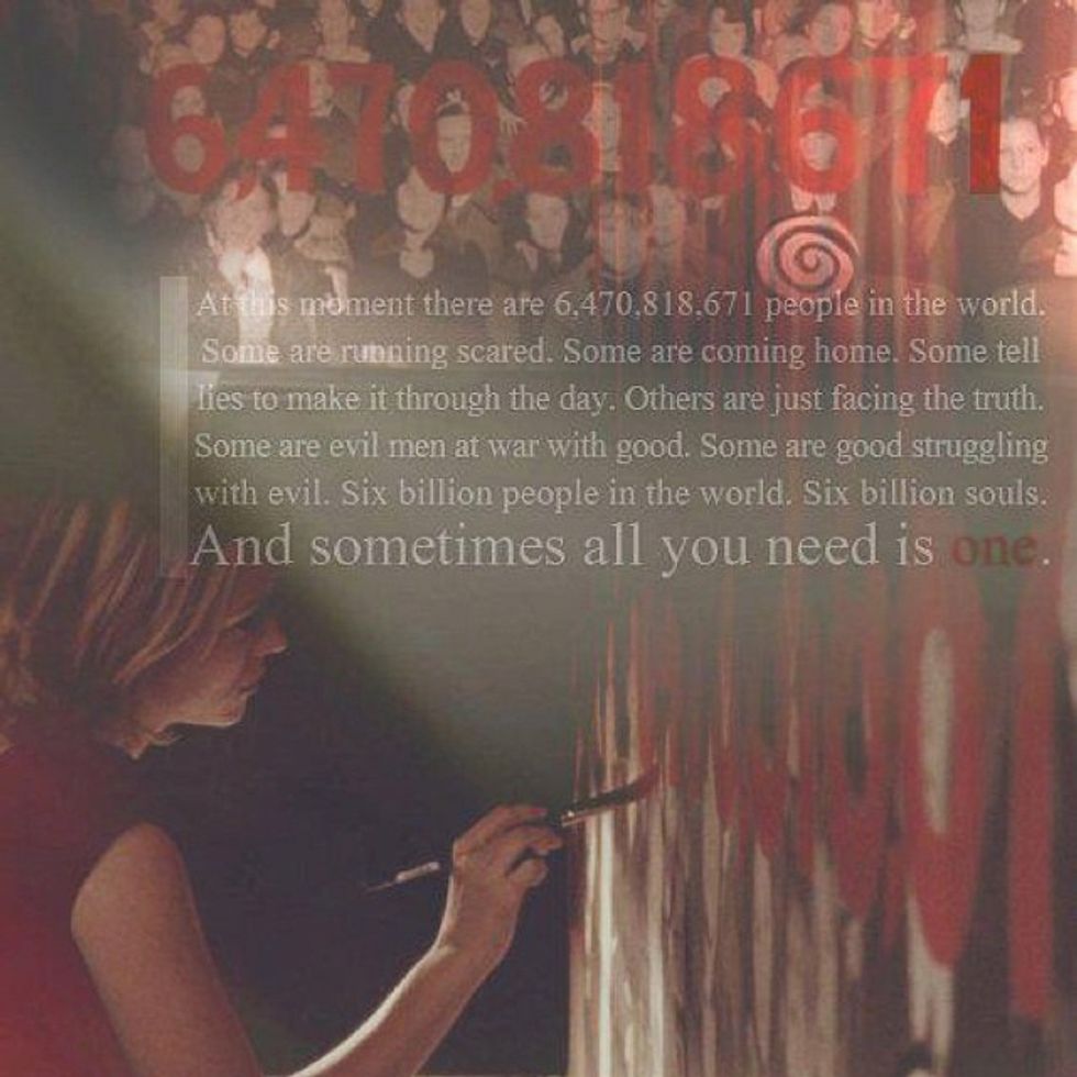 19. “At this moment there are 6,470,818,671 people in the world. Some are running scared. Some are coming home. Some tell lies to make it through the day. Others are just now facing the truth. Some are evil men, at war with good. And some are good, struggling with evil. Six billion people in the world. Six billion souls. And sometimes -- all you need is one.” -- Peyton Sawyer