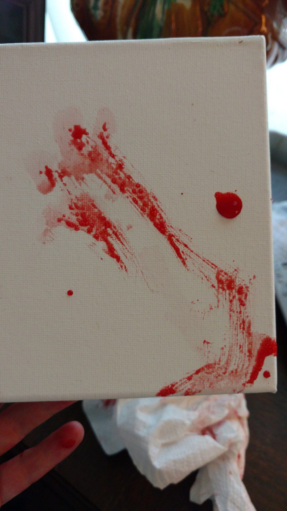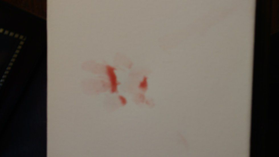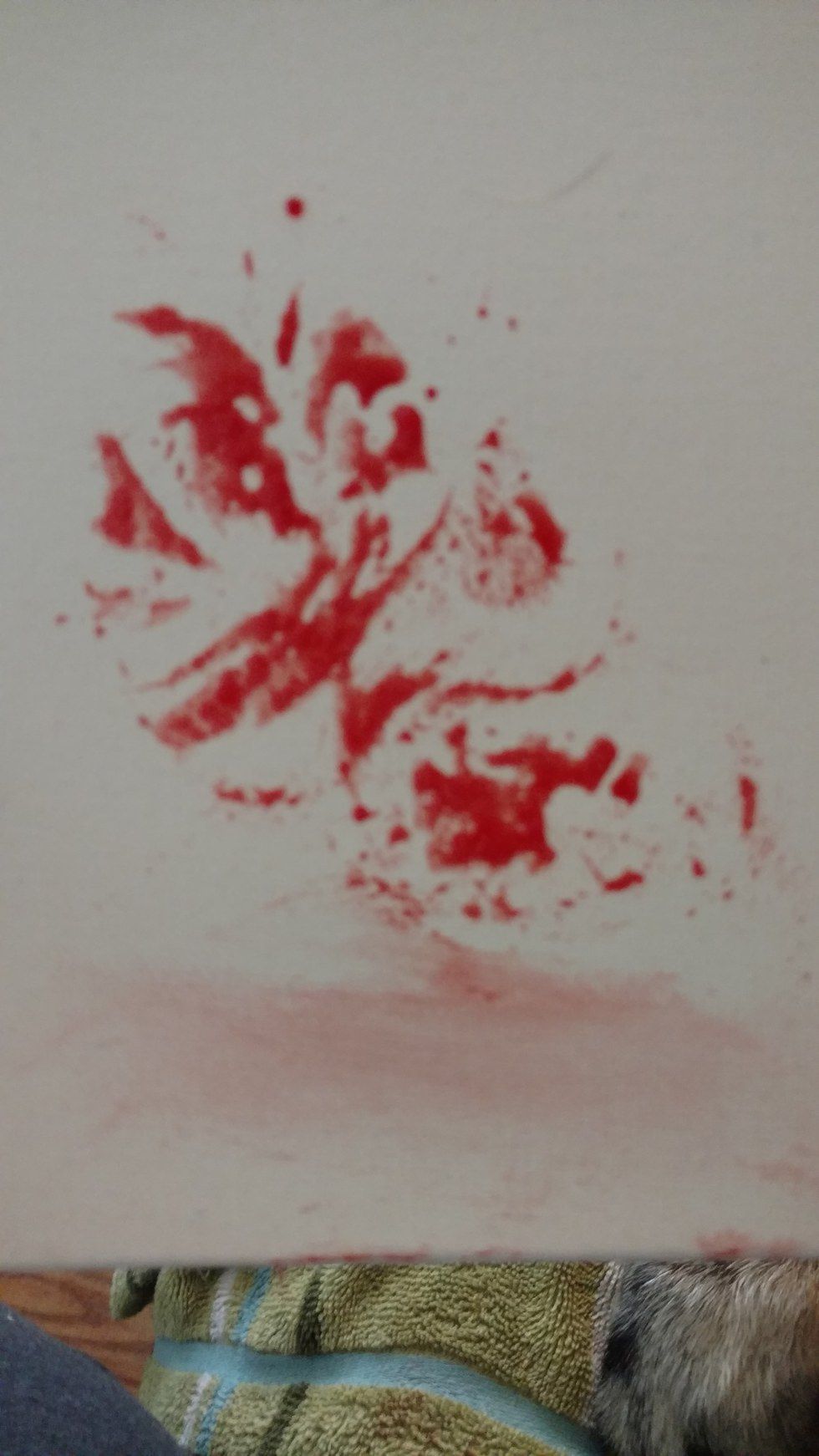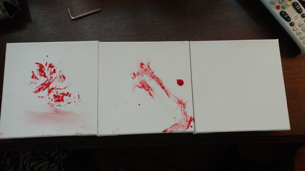 Now I had to decide how I would approach each individual dog and press their print. Again, each dog has a completely different personality and comfort level; these concerns were of my highest priority. If they are not of yours, do not even attempt to do this. My parents and the puppy went out so I had not choice except not to do Bella's. She is also in her teething stage, so I would rather not be nipped with her razor-sharp teeth. I decided that Pig would be my first model. She pranced happily around the couch before plopping down. I grabbed a ton of paper towels with my Kool-Aid concoction and sat beside her. I placed her foot on the canvas and gave her a treat before painting the bottom of her paw. She was more interested in licking me than staying still, but I had gotten her print on the canvas!