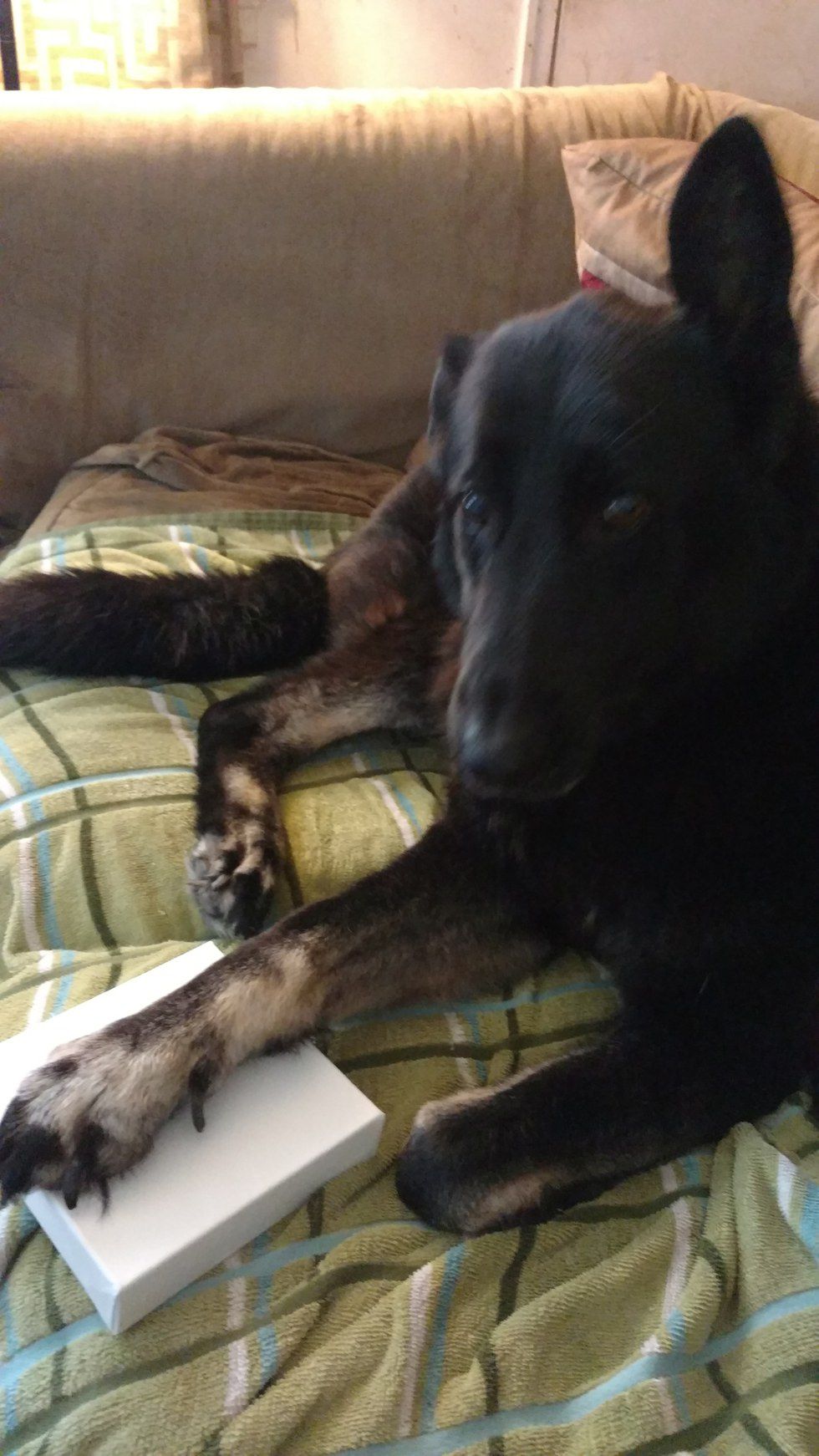 As you can tell, it was not as successful as I thought it had been. I realized I made two mistakes: My mixture was too watery (50/50 water/Kool-Aid) and I did not press her paw hard enough. She waited on the couch while I made the formula 10/90 (water/Kool-Aid). Maybe this would work better. I also grabbed a towel and some wet paper towels (if you inspect the couch close enough, you can see tiny Pig prints). I tried it again and just as I thought I had it, she started to get a bit uncomfortable. I could see her attitude shift and she started to act a bit antsy and nervous, so I let her go. After a few minutes to calm down, I did wipe her paw clean with the wet paper towels and gave her two treats. Needless to say, she was happy, but I was a bit disappointed because the brat did this right as I let her go: