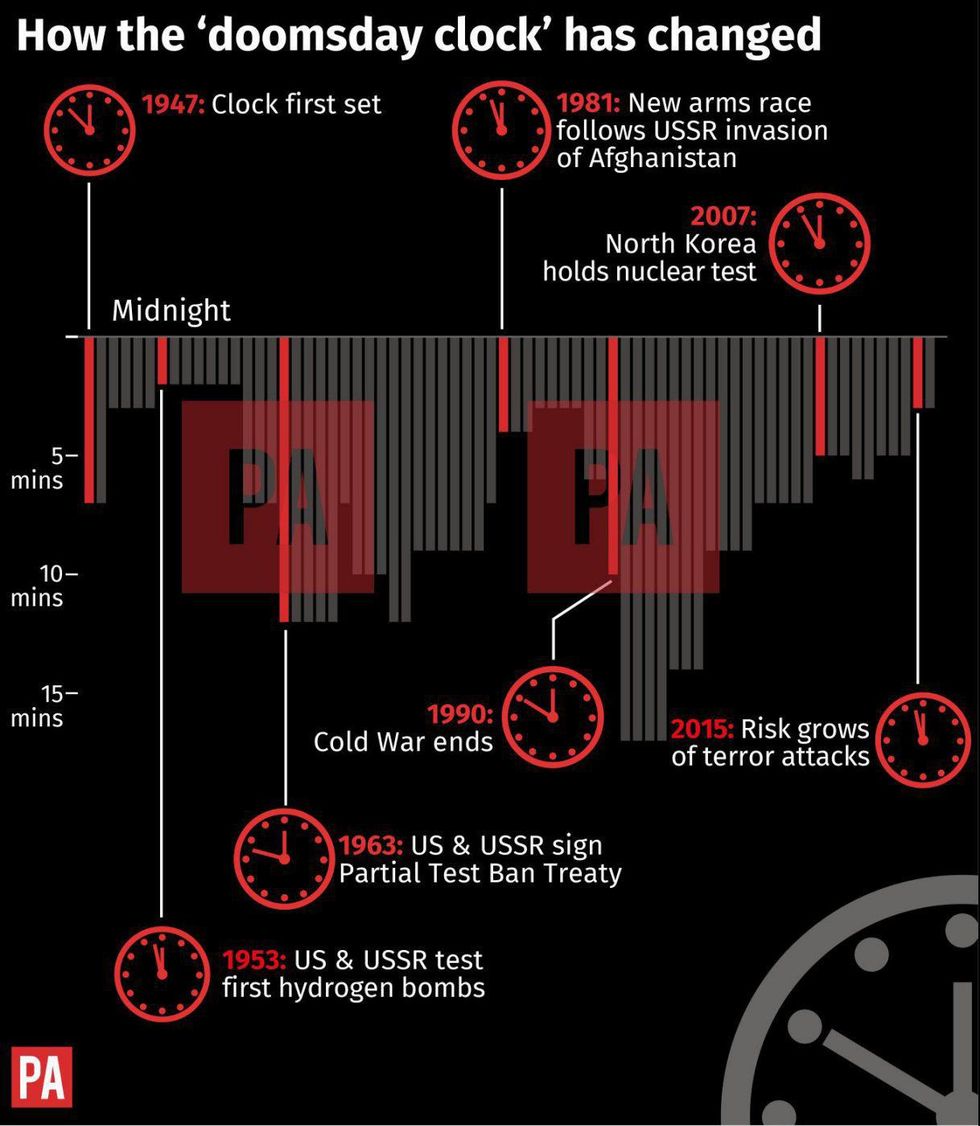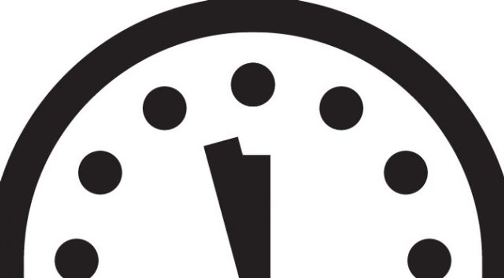 “The Doomsday Clock is an internationally recognized design that conveys how close we are to destroying our civilization with dangerous technologies of our own making. First and foremost among these are nuclear weapons, but the dangers include climate-changing technologies, emerging biotechnologies, and cyber-technology that could inflict irrevocable harm, whether by intention, miscalculation, or by accident, to our way of life and to the planet.”