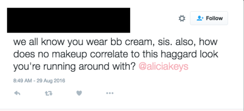 Tweeters from near and far came to criticize Keys and her choice to not wear makeup to this star studded event. Of course while her fans and supporters of the movement also showed up to the party to praise her, the hate piled on thick (much like the foundation most women cake on their face on a daily basis, yeah I went there). Most felt that the whole movement was a sham and Keys was being fake about it and that there was no way she wasn't wearing makeup. Others started to give her makeup tips telling her she looked like a mess and to at least put on some concealer