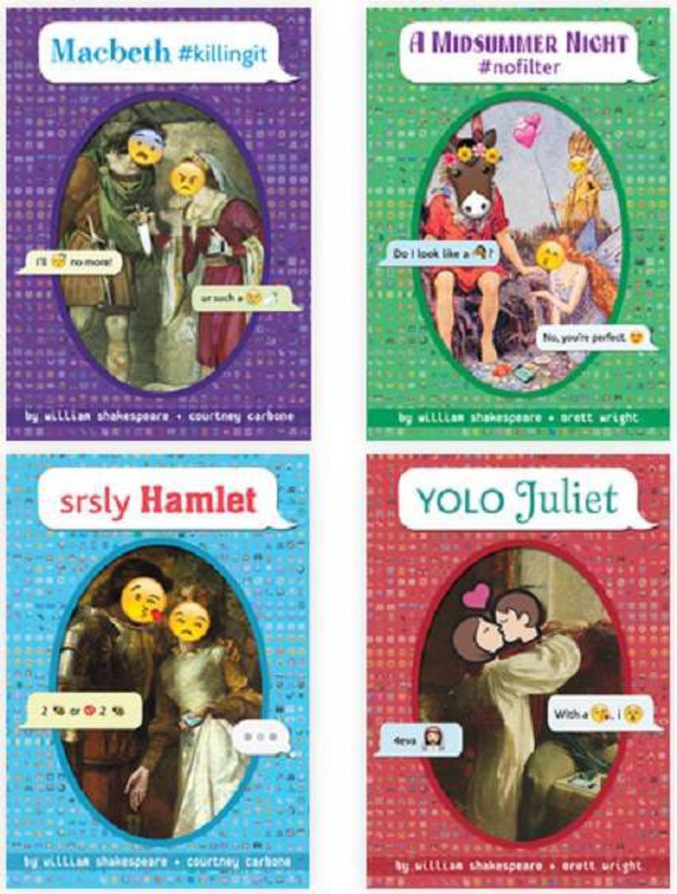 I know some people are going to have a cow about this, but really there isn't a problem here. Emojis and text language are how the next generation communicates, and nobody uses Shakespearian language anymore. It only makes sense to use text language and emojis to get them to read AND understand the story. It's the same as having a modern English translation on the opposite page as the original text. So if you've had a cow, keep it to yourself.