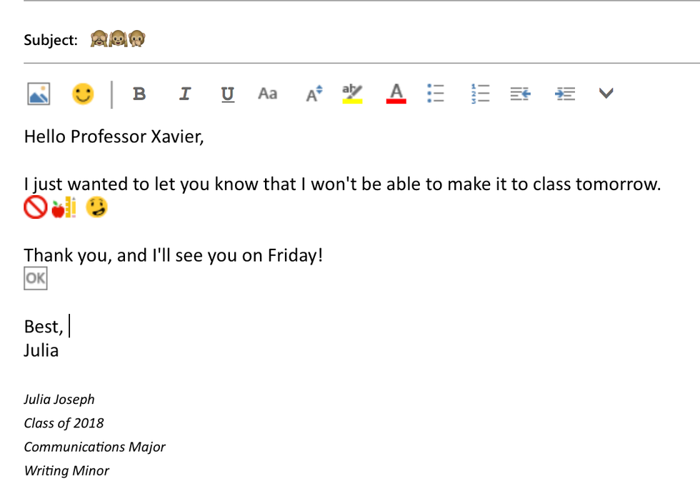 However, emojis don't just stop at your phone's keyboard. A variety of emoticons, mostly inspired by the popularity of emojis, have arisen in different texting apps, and even some email carriers. For example, this year I could be sending this email when I can't make it to class.