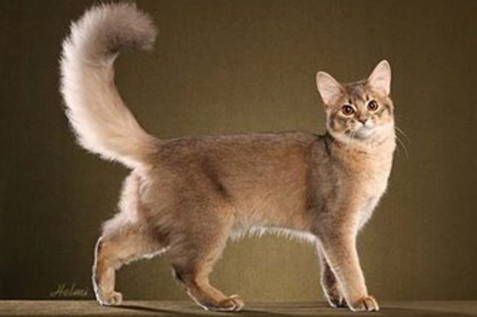 The Somali Cat looks like a mix between a cat and a fox. Though their color is similar to that of the Abyssinian, their fluffy foxy tails set them apart. These cats have thicker coats than a normal domestic cat does, they are relatives of the Abyssinian cats just with longer hair. I mean just look at that fluffy tail!