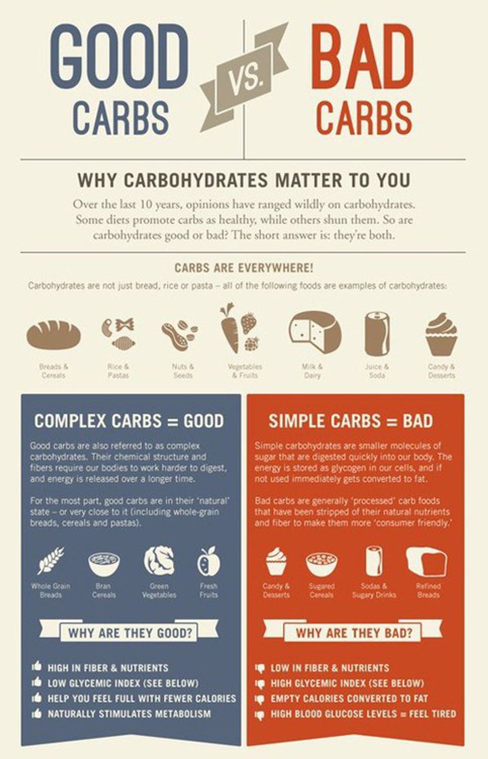 The chart below shows the difference in good carbs and bad carbs. This is very important to understand if you are trying to eat healthy or lose weight.