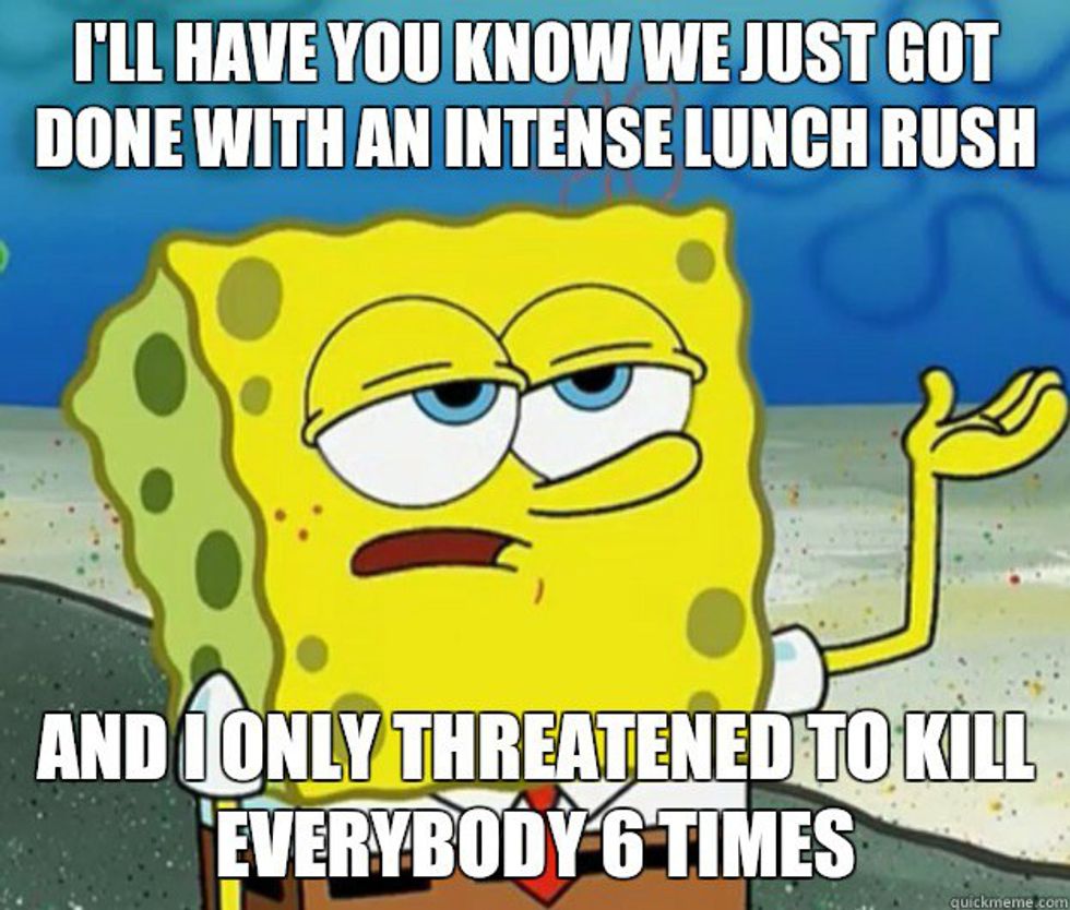 In the restaurant business, you have the luxury of working with an estimated amount of forty coworkers in a small space each shift. Each person is always in a hurry to get their tasks done in order to keep the place running smoothly. Whether it be accidently bumping into someone, pushing through a crowd, or ten people speaking at once; someone is always going to be in your way. With this in mind, you will have to learn how to take your turn and be patient. Patience is key!