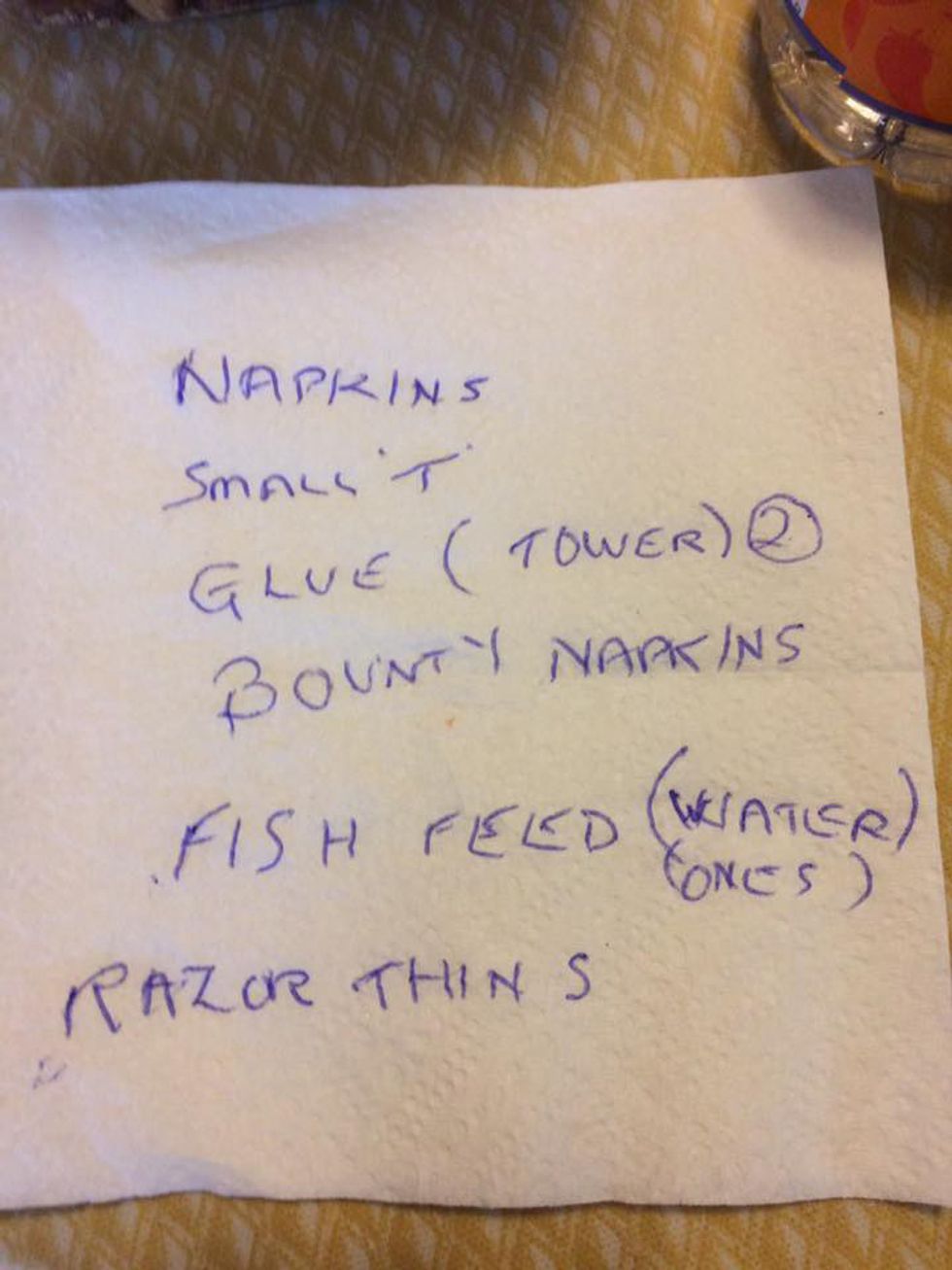 Poppick never writes shopping lists, however, on one day the mood struck him and he rifled through his home and found a pen, and a napkin. The first item on his list was napkins, and the rest were written in some sort of indecipherable code that later Poppick didn’t even recognize as his own work. Here is a photo of the actual list: