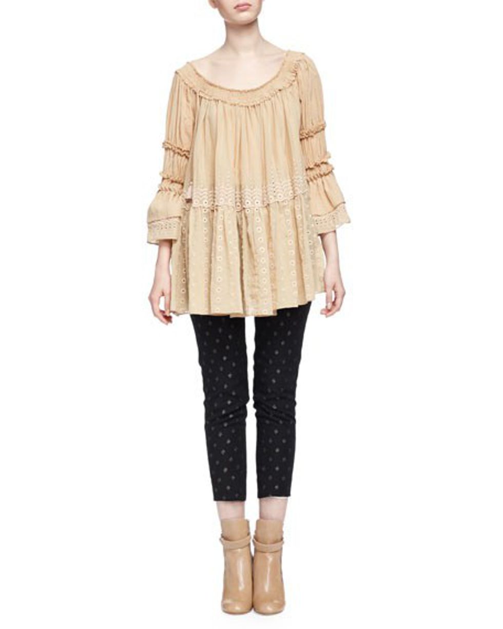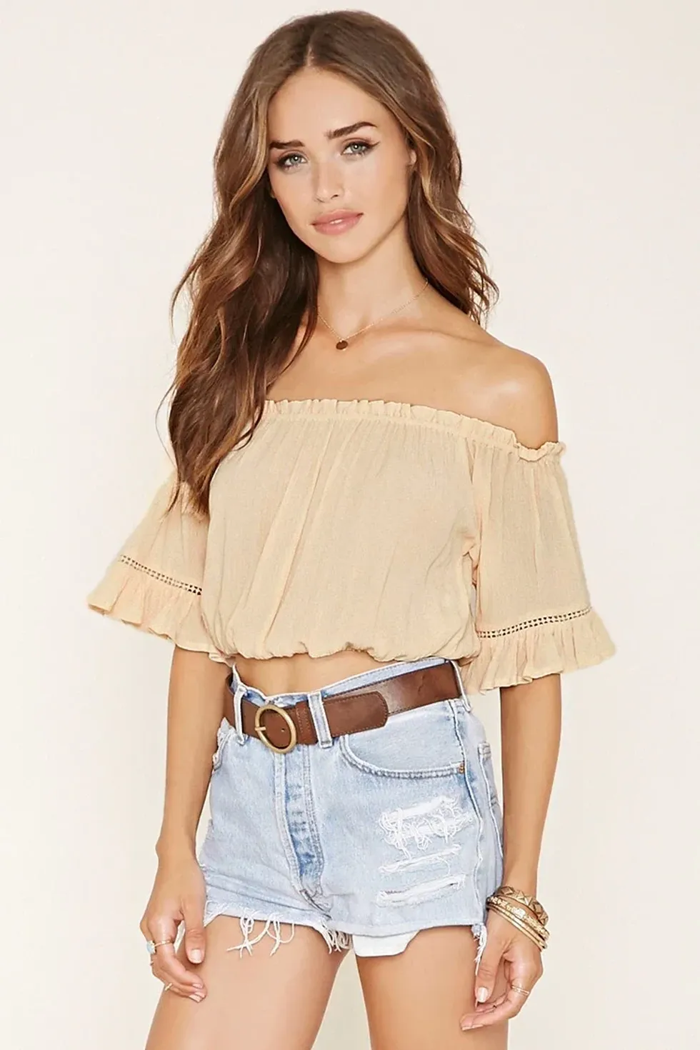 Both of these off-the-shoulder tops in a beige rose/peach color have a certain amount of detailing in the pleated neckline and embroidery, but the peasant top by Chloé above ($1,850) shows far more detail and layering, making the top fully 3-D, whereas the Forever 21 ($14.90) crop top is more simplistic.