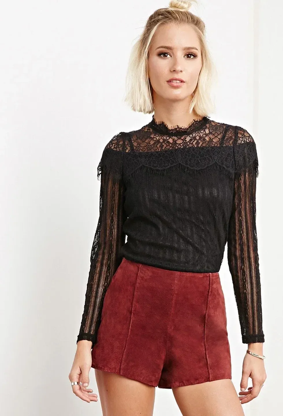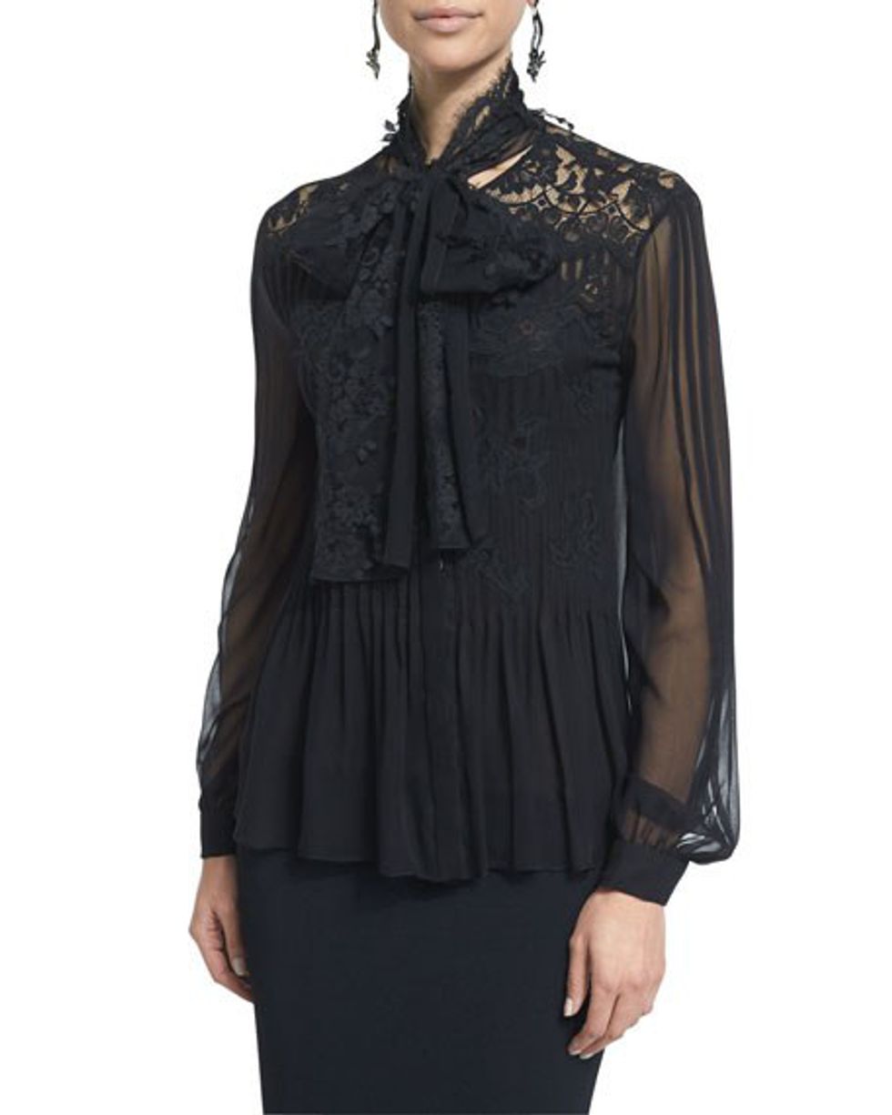 The Forever 21 striped knit lace top ($86) is almost a dead ringer for the Oscar de la Renta lace-inset chiffon blouse above it ($2,290). The silhouette and detailing is more intricate in the designer top, which is only to be expected, but the F21 top hits fairly close to home.