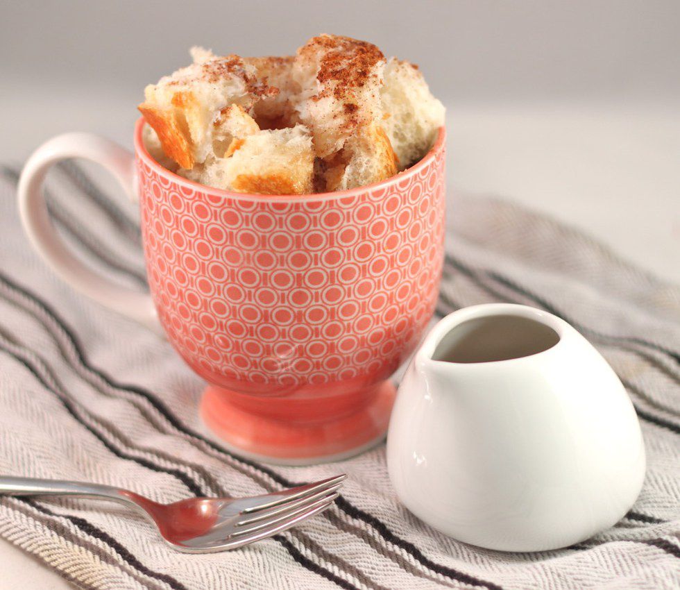 If you are looking for something to make with that loaf of bread you bought (but will actually never use) this french toast in a cup is perfect! The french toast only takes two minutes to make, making it an ideal alternative to cereal when you are in a rush.