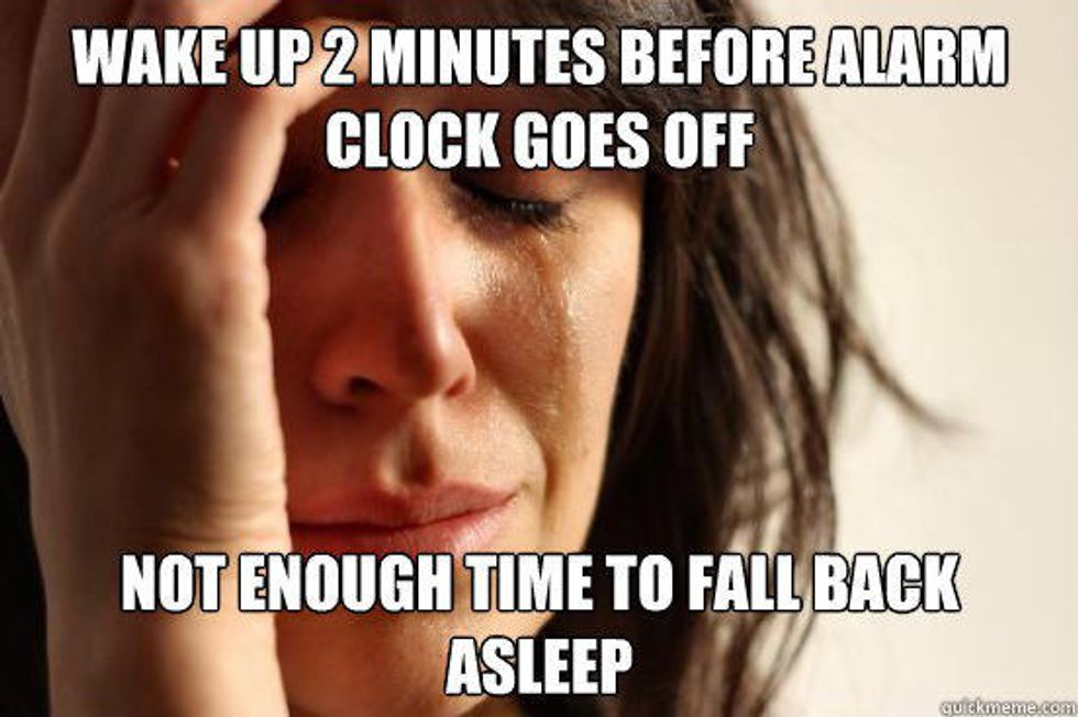 3.)Never fails. My body's natural rhythm causes me to wake up before my alarm everyday. Even on the weekends, my body jolts awake at about 6:30. During the week, my alarm isn't set to go off until 7:30, but every morning at 6:30 I'm awake just trying my best to go back to sleep, and it doesn't work.