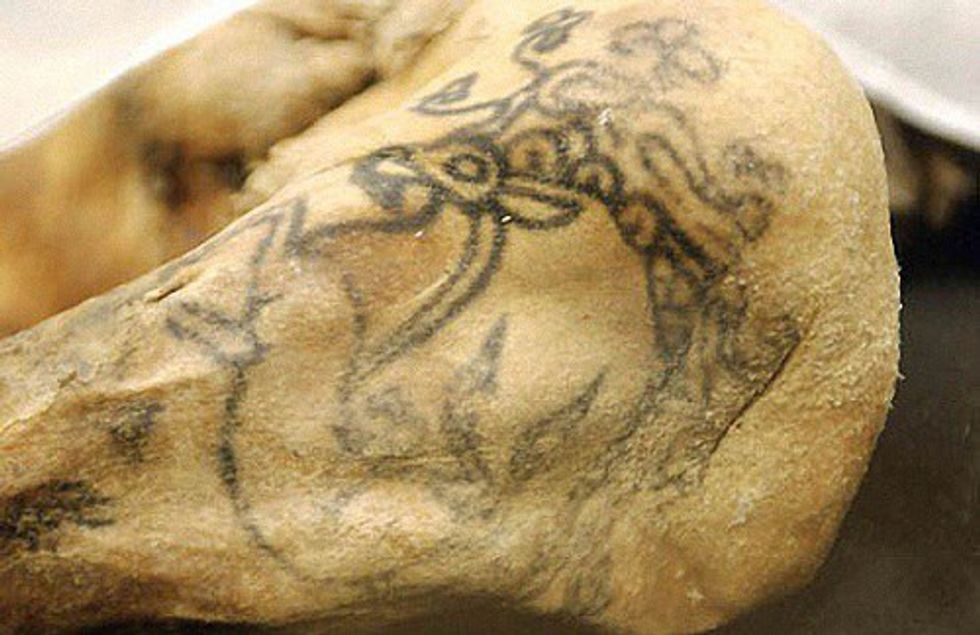 Recently, Otzi, the Iceman, was the oldest human being to be found, and has over 60 tattoos. However, they're no longer visible to our naked eyes and require special ultraviolet light to view. The oldest tattoos that are visible are found on the mummified, 25-year old Siberian-Iranian Princess Ukok. Her famous shoulder tattoo is an elegant portrayal of a lively horse with a griffon's beak and flamboyant horns.