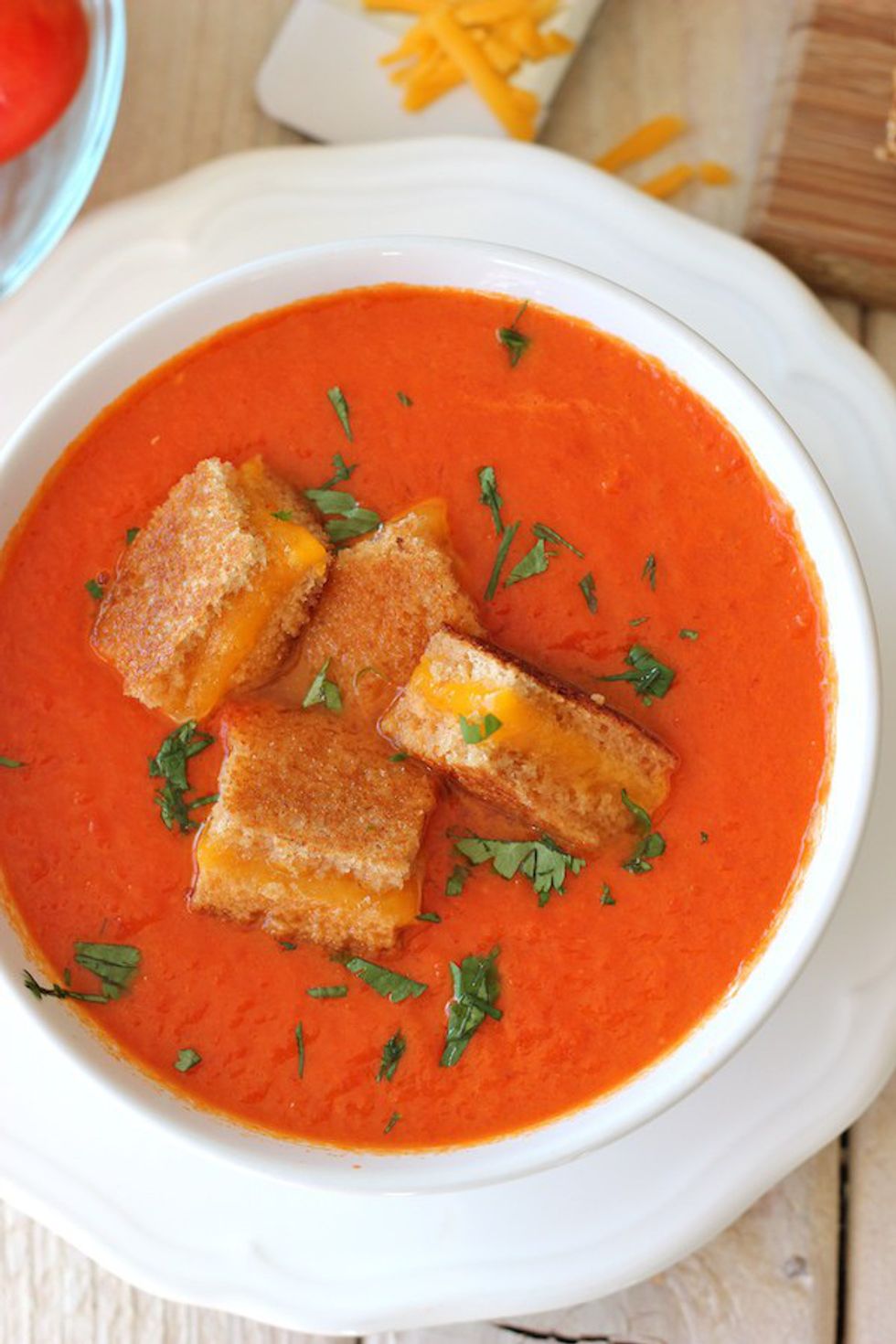 9. Creamy tomato soup with grilled cheese croutons.