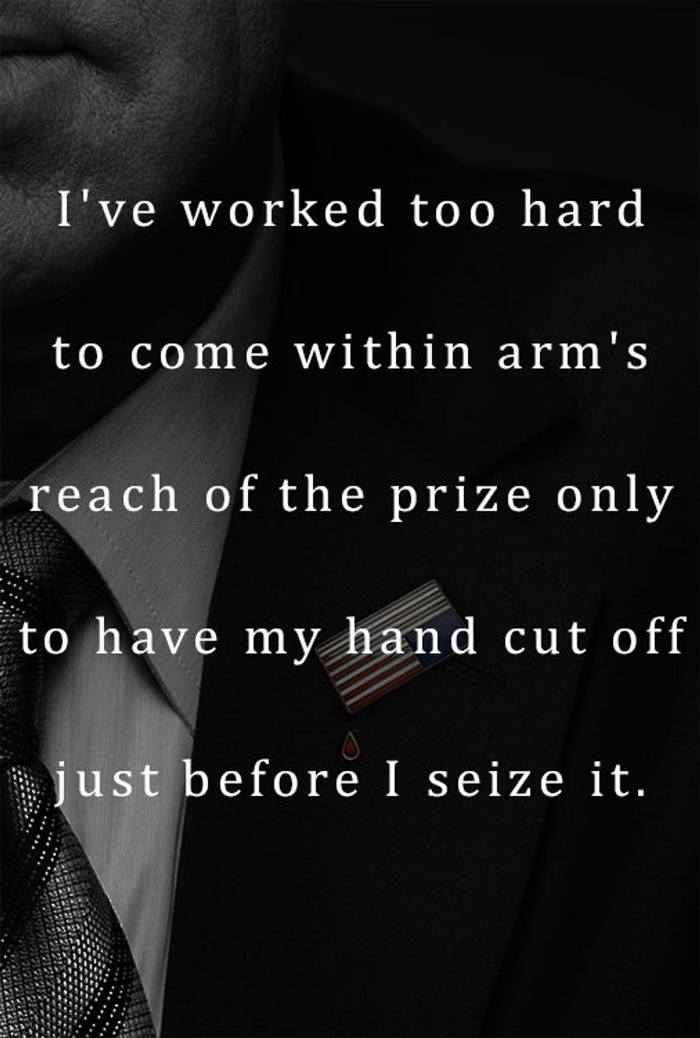F.U. The initials are fitting for a man hungry for power and control, a man so ruthless and cold that he is willing to lie and even murder anyone who dares get in his way. F.U. is layers of false promises and placating smiles. The initials embody all that is Frank Underwood: F.U.