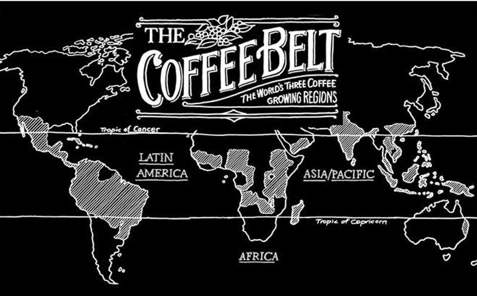 All coffee is grown in between the Tropic of Cancer and the Tropic of Capricorn in a region known as the coffee belt.