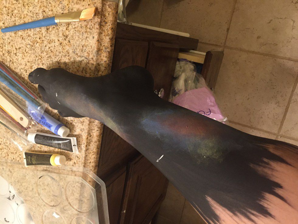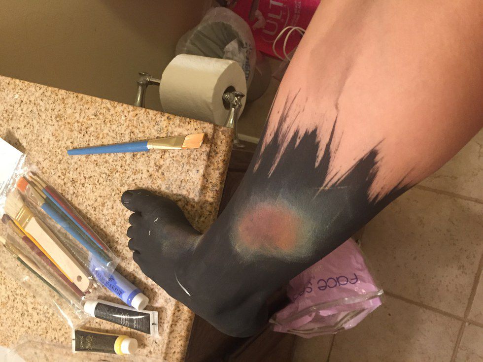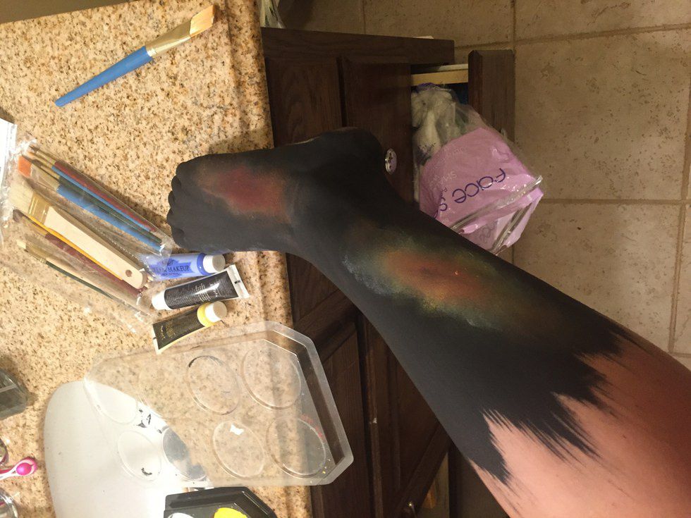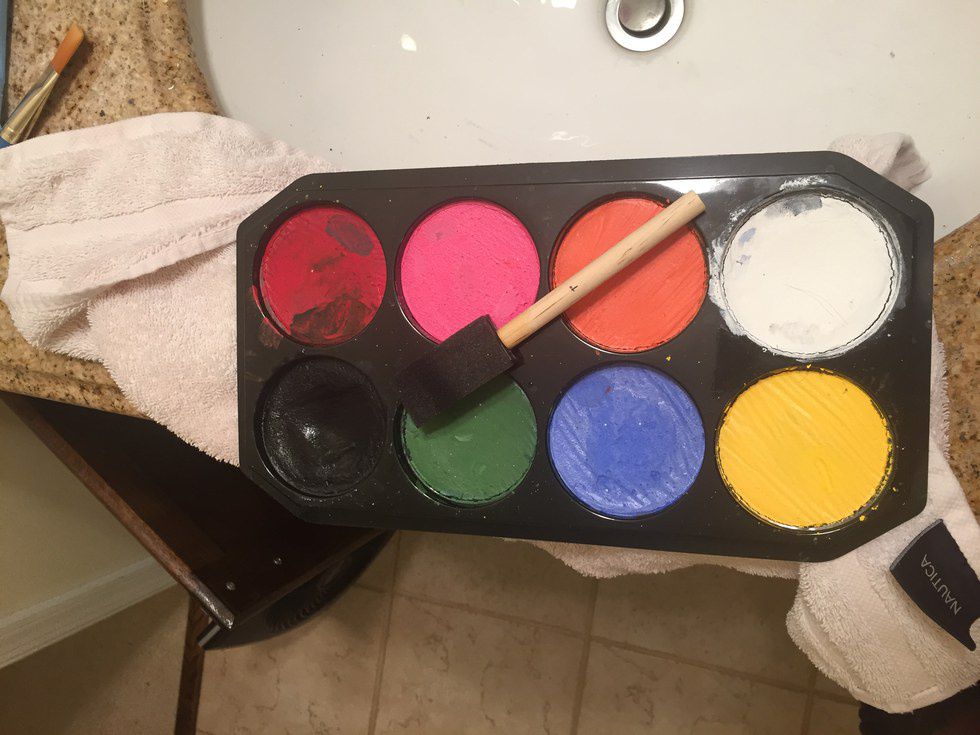 Materials: black, white, blue, yellow, orange, and red body paints, various brushes (any will do you just will need different sizes), sponges