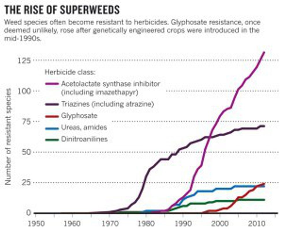 By growing genetically modified crops, farmers are promoting pesticide-resistant insects, herbicide-resistant weeds, and other types of plant diseases. These new “superplants” could out-compete domestic plant life. In one instance, a type of weed is now able to grow to over 2 meters in height due to its resistance to herbicides (Miller and Spoolman, 293).