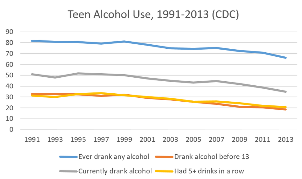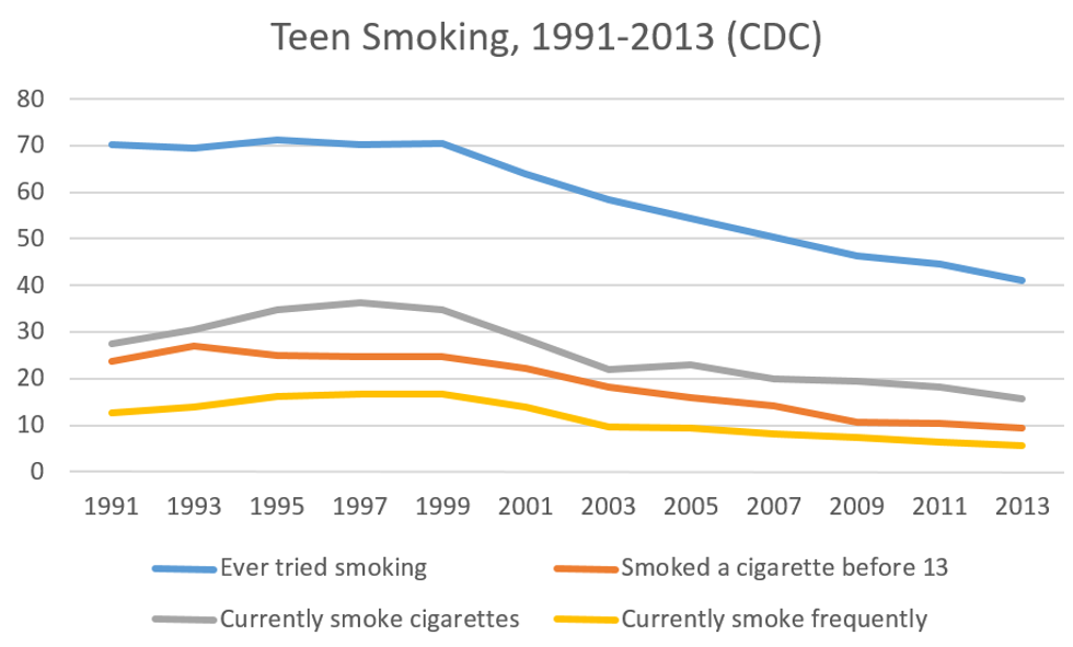 alcohol consumption rates have been consistently dropping since the 90's. (Note: on all of the following graphs, the y-axis represents the percentage of American youth doing the indicated behavior):They aren't "smoking more"—youth smoking rates have dropped to the lowest in American history and are still going down: