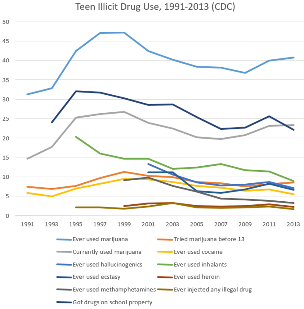 teen illicit drug use has generally declined or remained stable in the last twenty years, with the exception of marijuana use (which has fluctuated quite a bit but generally declined since its peak at the turn of the century):These statistics and more are freely available in detail from the National Institute on Drug Abuse, the Center for Disease Control, the Guttmacher Institute and DrugWarFacts.org.