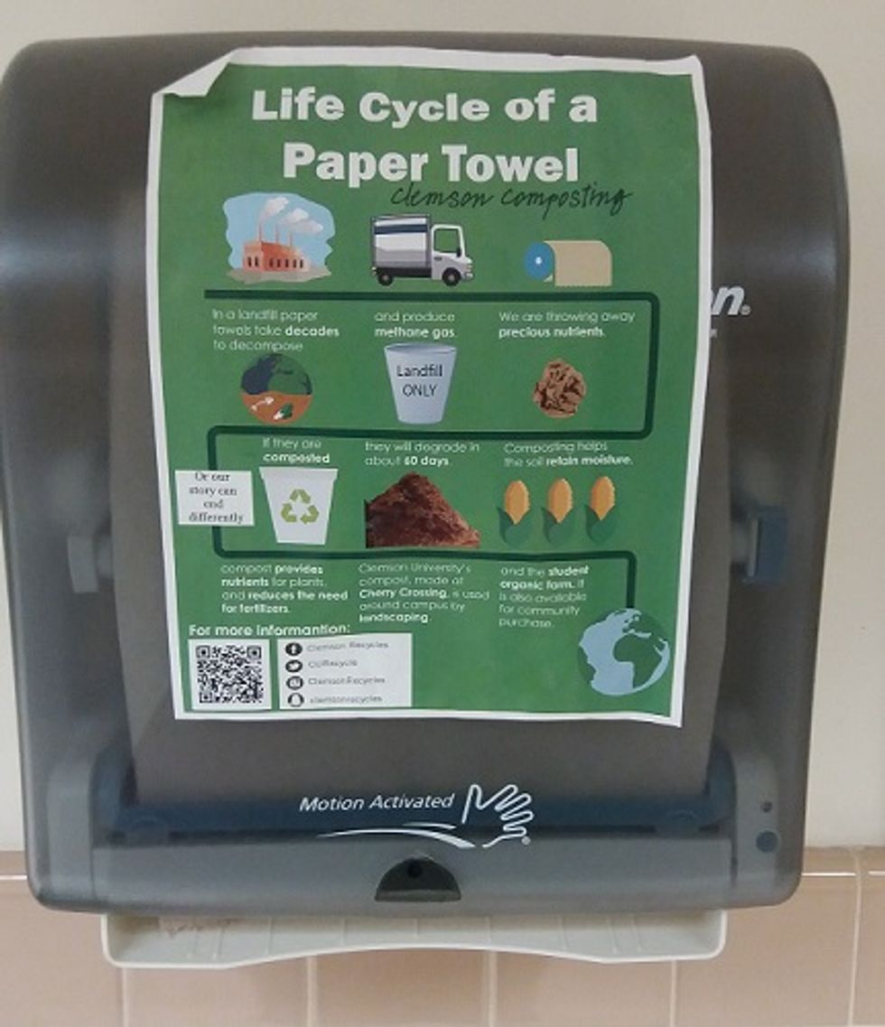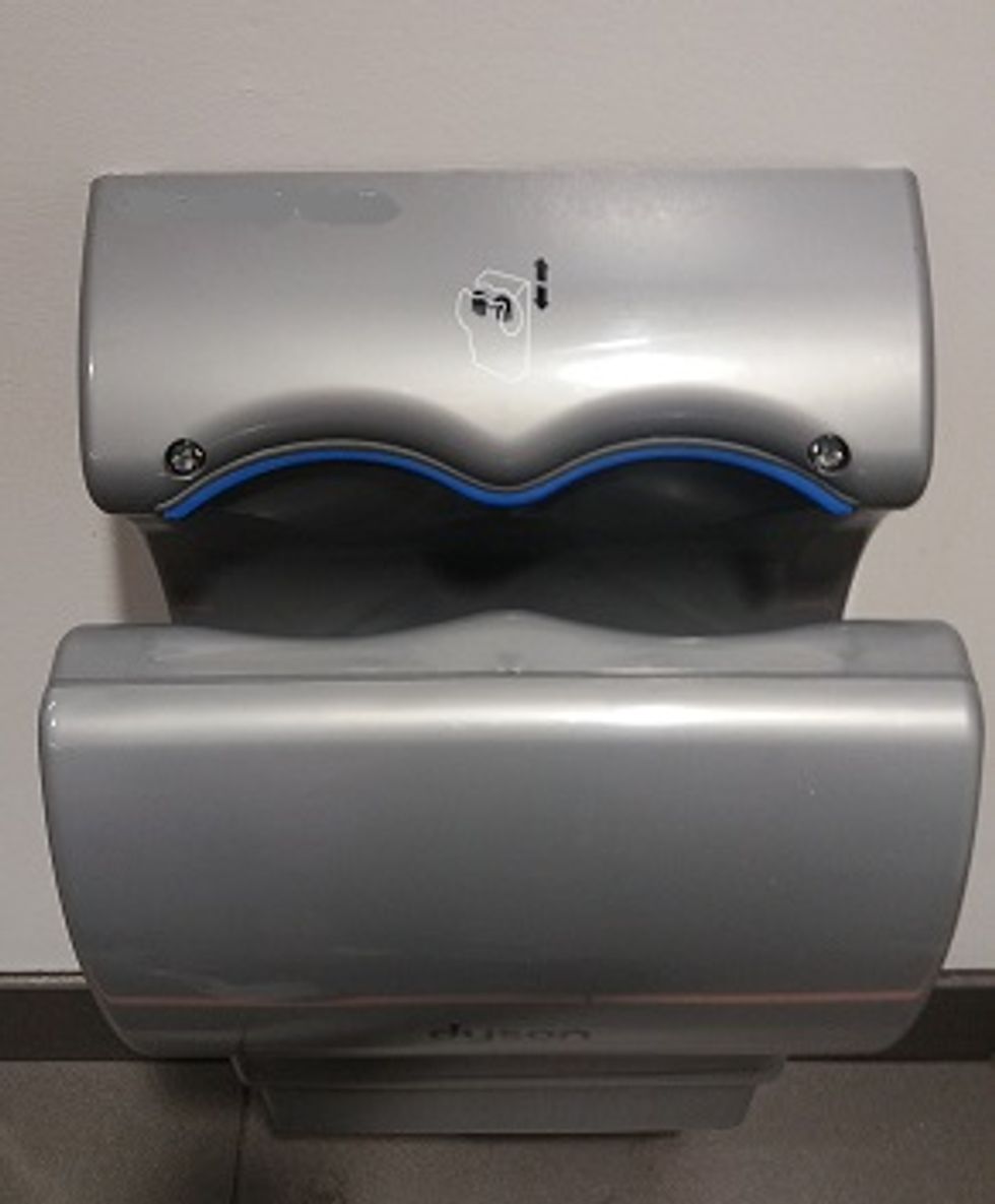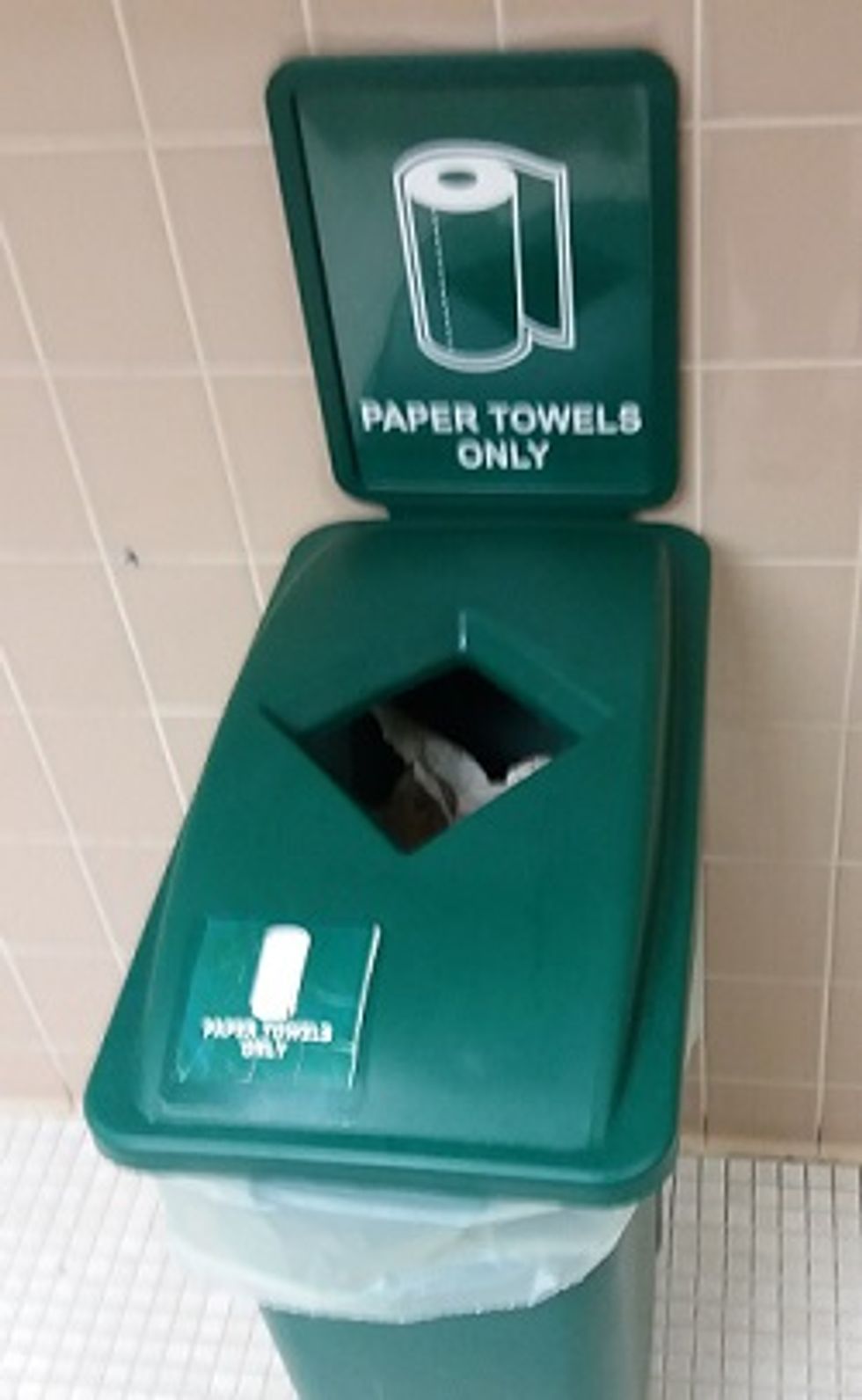 This Automatic Paper-Towel Dispenser is a fantastic product, that actually works as intended. As well as, a recycling bin just for used paper towels near it. This method can also save your poor shirt tail from falling victim to the icky door handle, while still having a recycling bin outside the door.