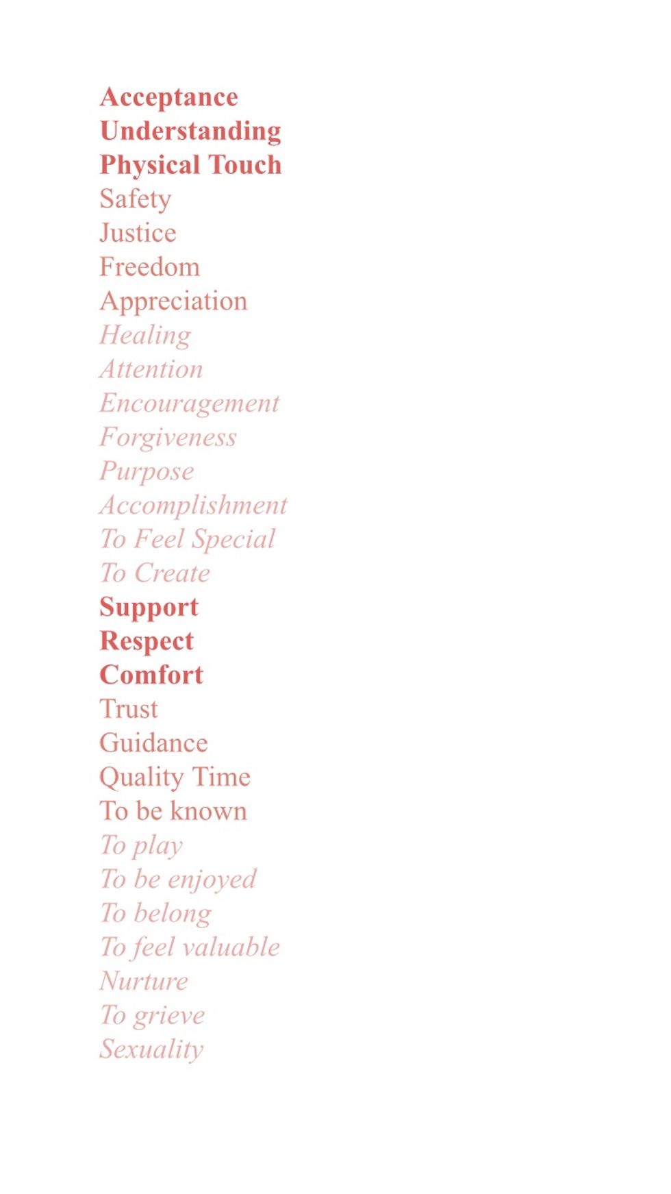 Have an internal conversation with yourself and ask, what do i need today? What am I feeling? How can I take care of myself today? It's important to listen to your body and communicate with it in order to care for it the way it needs to be taken care of. If you don't know what you need in that moment, be patient. I have included a sweet pic below, a menu if you will of all needs humans have to better identify the needs you want to be met, allowing you a game plan to go out and in fact get them met!