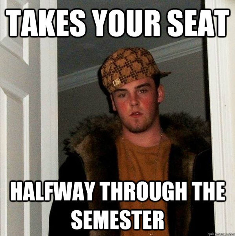 Low key this is everyone's biggest pet peeve. It's my unassigned assigned seat! I've been sitting there since day one! Give me my seat back. Unfortunately, we do sit in the same seat all semester long so we get into a comfort zone instead of getting new experiences and meeting new people in the class especially if it's a large lecture hall.