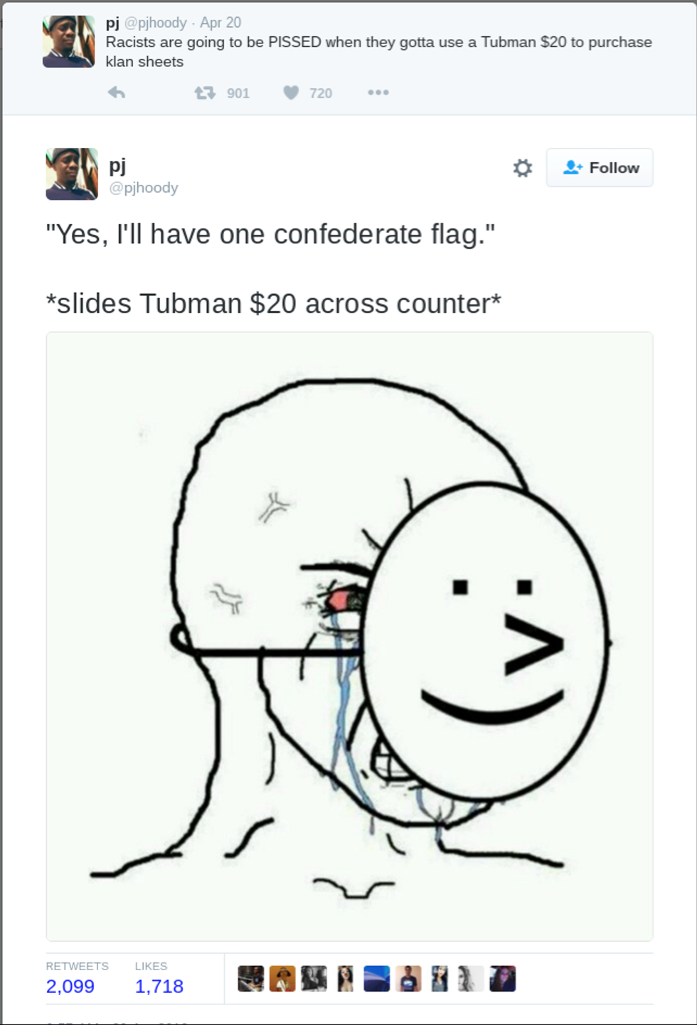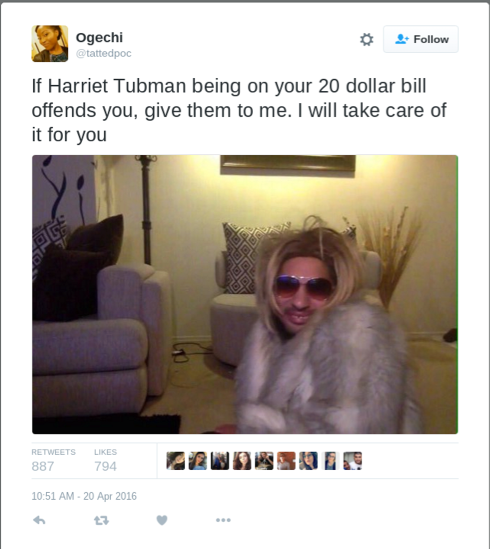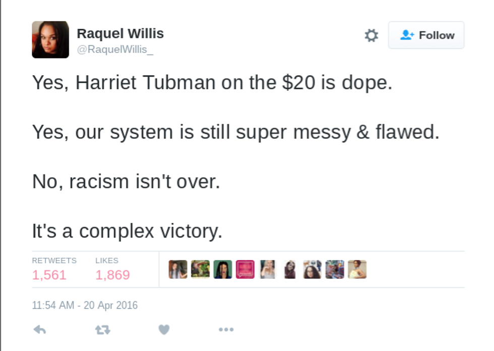 In my honest opinion, I don’t mind if my fellow blacks are represented on our currency, but I feel like that would not change much. As I read through my Facebook news feed I realized that some of my “friends'” opinions were legitimate. Just because we have her face on the bill does not mean that the issues that troubled that woman are over. We have taken one step further, but racism is an underlying issue and I don’t think we can change the minds of everyone. What we can continue to do is promote change on the outside.