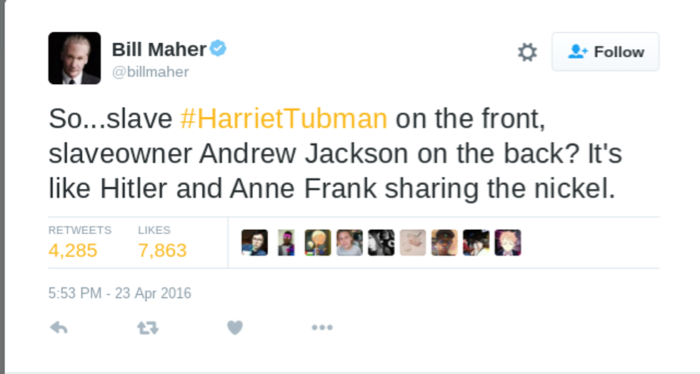 What is even more interesting is that there is news out saying that Harriet Tubman will be on the front of the bill while Andrew Jackson will be on the back. If this is the case, the United States as a whole has again failed Jackson and disrespected his wishes. In addition, it will be ironic and no one on social media seems to explain it as well as comedian Bill Maher.
