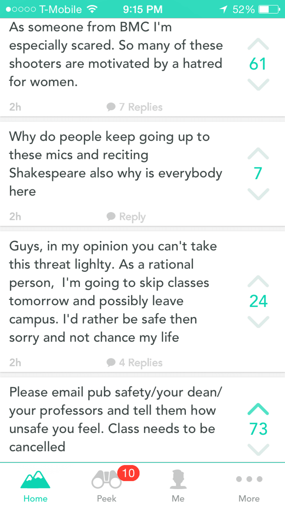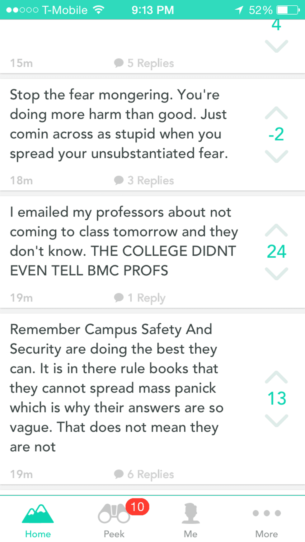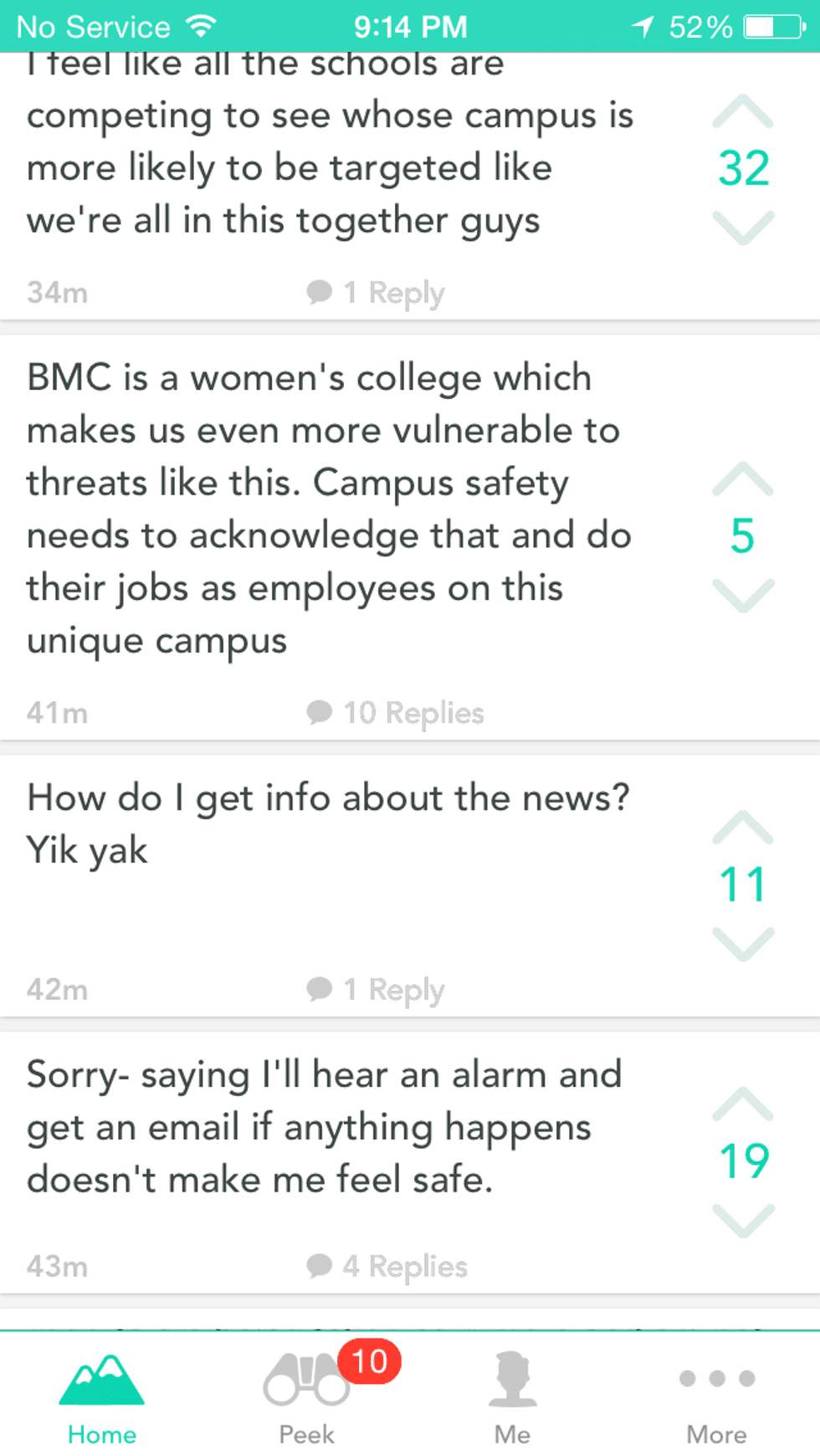 My school's Safety and Security is deeply trusted and appreciated; I believe that they have taken every necessary precaution and made every correct preparation in light of this threat. But right now, my community at Haverford College feels uncertain. Haverford College and Bryn Mawr College are very close, so the following screen shots of Yik Yak from earlier tonight contain the words of both Bryn Mawr and Haverford students: