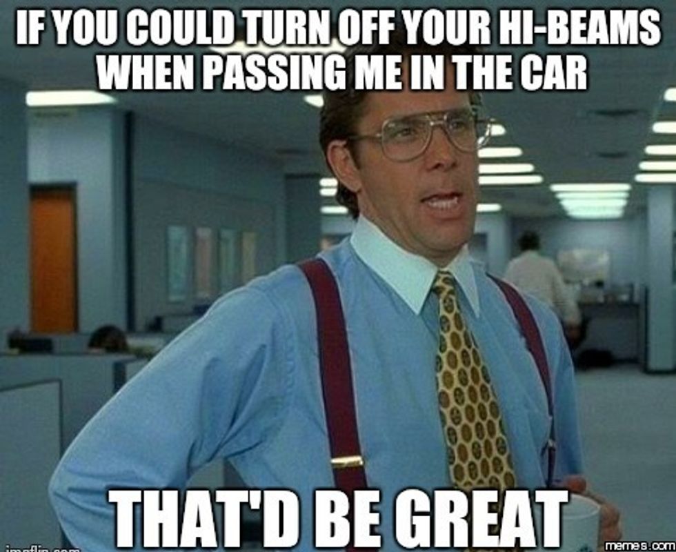 High beams are great when there aren't many street lights and it is night time. High beams AREN'T great when you're passing a car that has them on. LITERALLY BLINDING. It takes less than two seconds to turn them off when you pass another car, so that you don't blind the opposing driver. What's even cooler, is that you can turn them RIGHT BACK ON when you PASS THE CAR! Fascinating, I know.