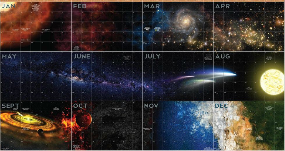 If we condensed the creation of the cosmos into a calendar year starting on January first at 12:00 a.m. and ending on December thirty-first at 11:59 p.m. Every month lasts about a billion years, every day lasts about 40 million years. According to this calendar, the entirety of human life would only take up the final hour of the final day of the cosmic year.