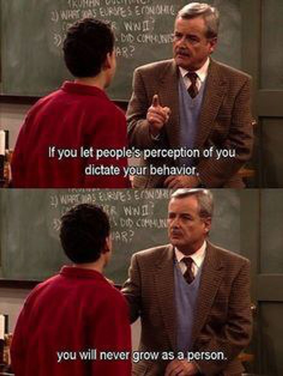 Throughout life, people will always have an opinion of you. Sometimes those opinions will be positive and sometimes they'll be negative. People will try to change who you are and make you more like them. One of the most important lessons the great Mr. Feeny taught us is that you shouldn't care what other people think of you. If you want to grow as a person, you need to forget about who will say what and just do what makes you happy. People will always have their opinions but you will grow so much more if you live life for yourself instead of for others. Mr. Feeny helped us figure out who we are, and for that we can be grateful.