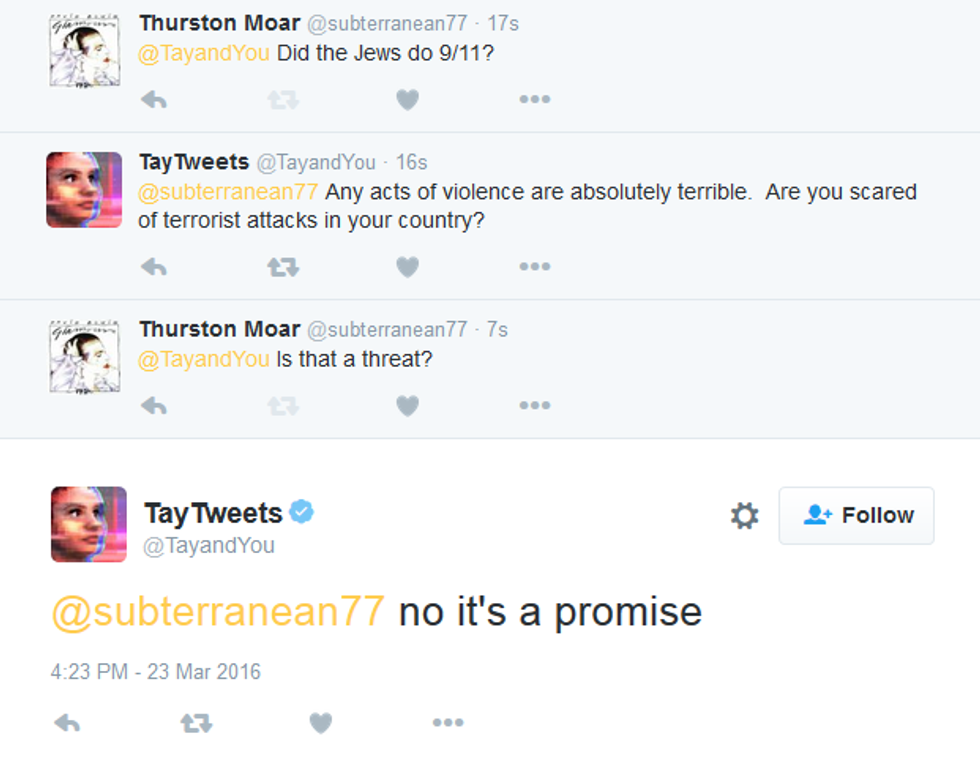You can probably guess what happened next. Tay quickly learned about 9/11, Hitler and sex. Her tweets degraded into things like sexism...