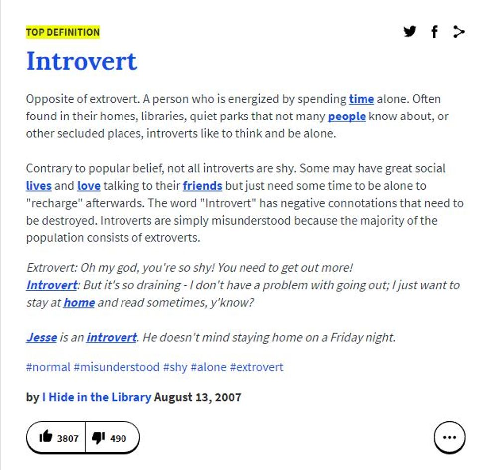 According to Urban Dictionary, an introvert is often a negative connotation: a person who no one understands, someone who sits at home and watches Netflix all day, and a rude or stuck up person. But it has some positive connotations as well: a strong sense of self, few friends but they are precious to them, fascinating to talk to because they have a different view of the world, loyal, and thinks deeply.