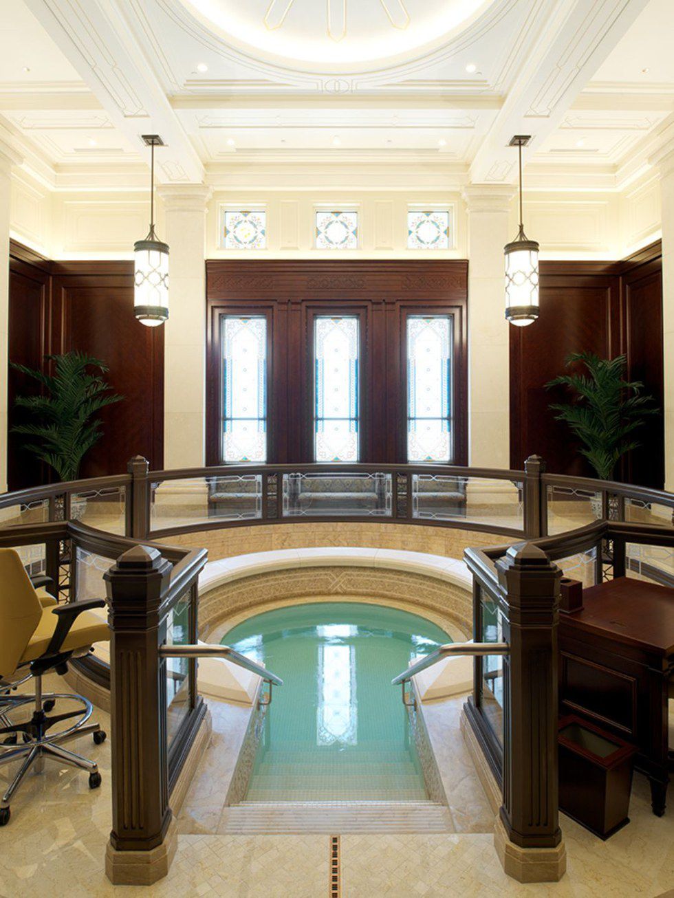 The second ordinance room had a wall of stained glass windows, vaulted ceilings, and various lighting fixtures to "keep the room bright."