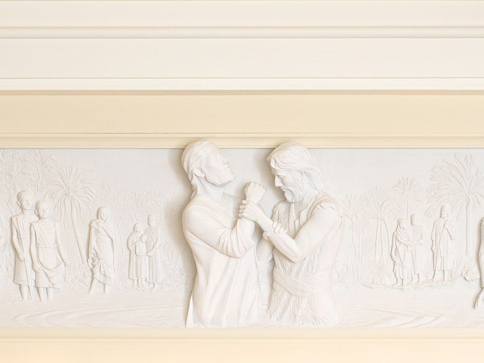 After another group exited the baptismal room, our group was led in. The room was bright and I could see my reflection in the marble floors. In the center of the room was a circular glass and bronze balcony that met stairs on one side that led to the tile baptism pool. As I looked over the balcony, I realized the pool was held up by a base of twelve large bronze oxen (not pictured). It was explained to us that this baptism pool was specifically for baptisms that are dedicated to ancestors, who can accept them or decline them while they are in the afterlife. Along the top of the wall, straight across from the stairs, was a hand-carved mural of Jesus being baptized, which took the local Avon artist a year to make.