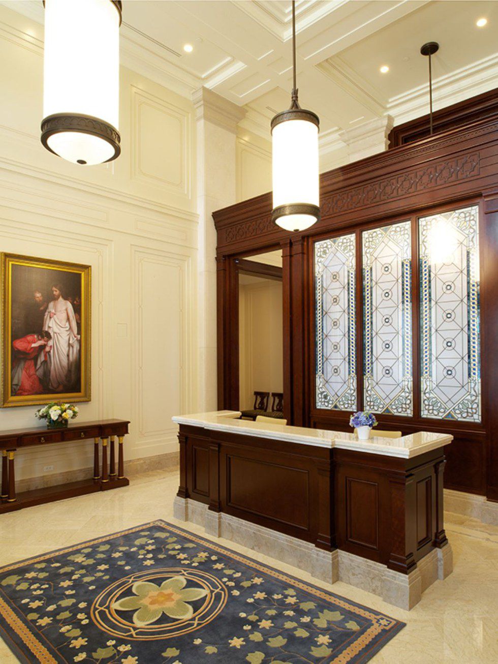 From there, we were led into the main entryway. We were told that every temple takes design inspiration from the state it is built in, which explained a plush rug on the floor in front of the main desk depicting a tulip blossom (Indiana's state tree). Tulip blossoms are depicted everywhere in the building, from the stained glass to the door handles.