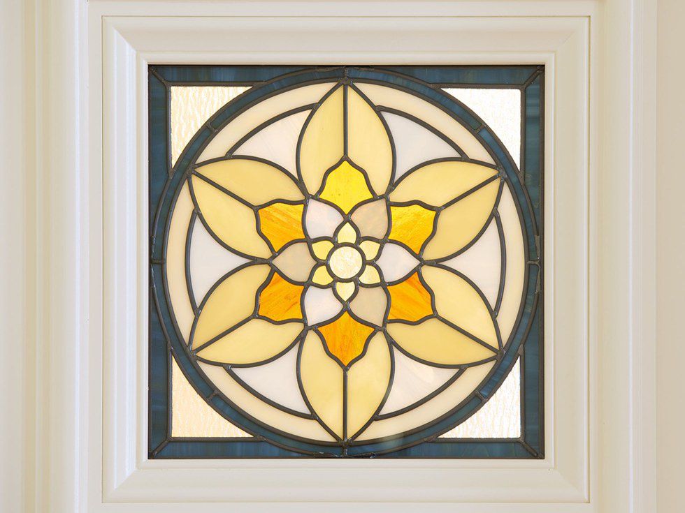 The tour guide, a member of the church, led us into an entryway and told us the next room we were going to enter was the baptismal room. As we stood there, I couldn't help but gaze around the small room in awe. Most of the entryway was white and cream, but the doors and trim were a beautiful, dark cherry wood. One wall had a slim, stained glass window resembling the one below.