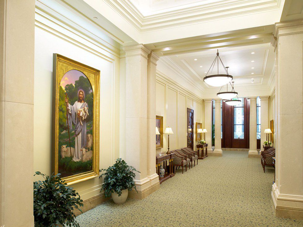 In the Meeting House, we were asked to watch a 10-minute video that explained what temples are and what the Church of Latter-day Saints believes and featured interviews with various members of the church. After the video, we were led to a walkway outside the east entrance of the temple and had plastic shoe covers placed on our feet in order to keep the marble and carpeted floors clean as we walked inside.