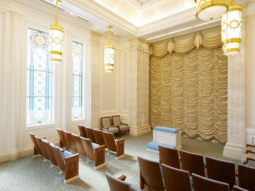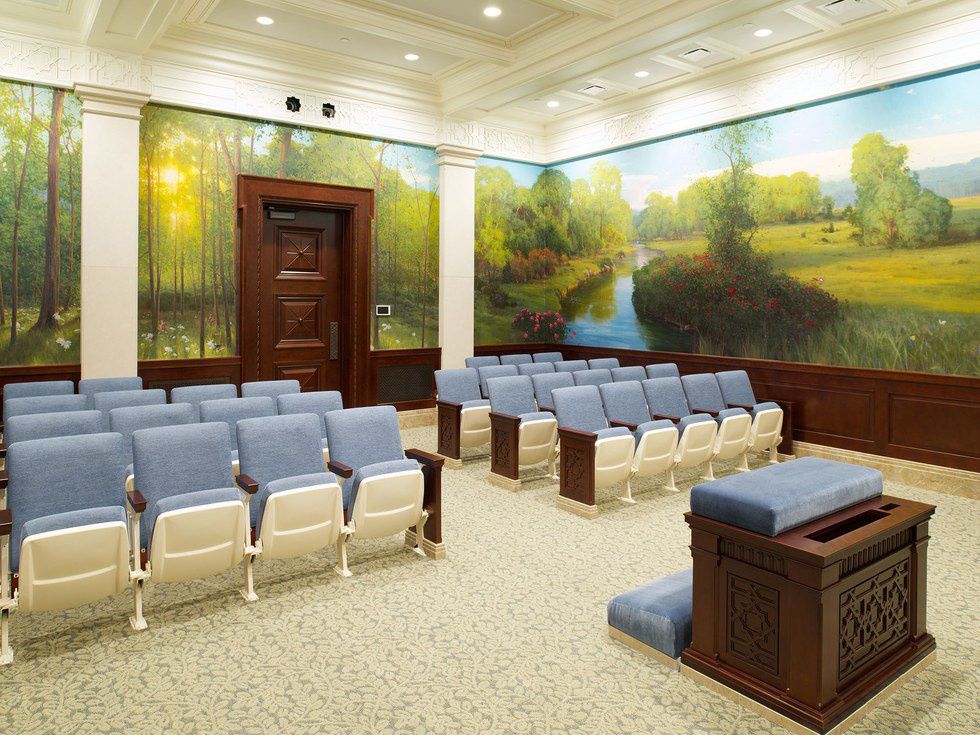 Lastly, our group was led into one of two Sealing Rooms, where marriage ceremonies take place. They have two of these rooms: one that seats 20 people and another that seats 50 people. Like most of the rooms, this one was also bright and had three stained glass windows on one wall. A chandelier hung over a cushioned alter made out of what looked to be some sort of stone. It was surrounded by more plush cushions that were to be knelt on by the married couple during the ceremony. Two large mirrors, just like the ones in the bridal room, hung on either end of the room and, if you looked into them, they reflected back and forth forever.
