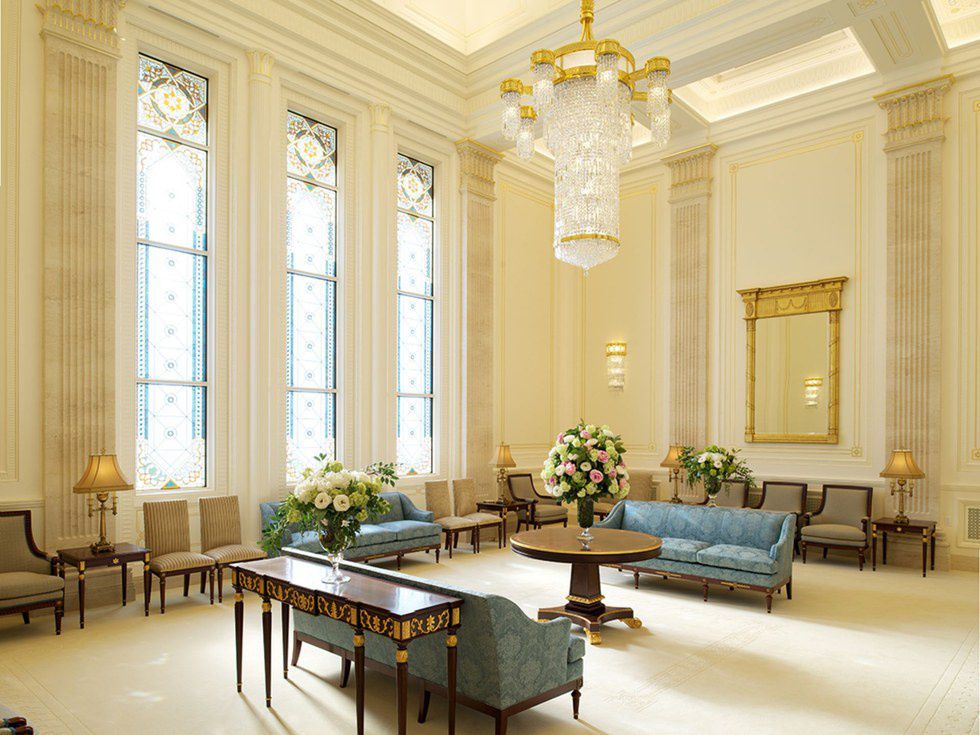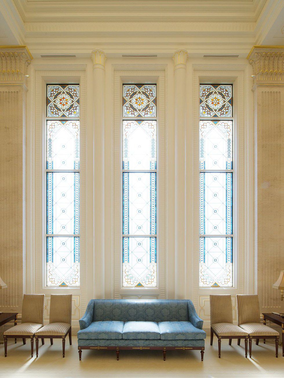 Our guide told us we were then going to the Celestial Room. He told us he wouldn't talk too much in this room because it was meant for meditation and thinking. This room was the most beautiful part of the tour. As pictured, one wall had three large stained glass windows. The ceilings were vaulted and had gold paint decoration in a minimalist design. A large chandelier hung in the middle of the room over a small table and two couches. While standing there, the guide whispered to us and said the carpet's ornate design had been handcrafted and cut into a single piece of carpet. It took two weeks to make.